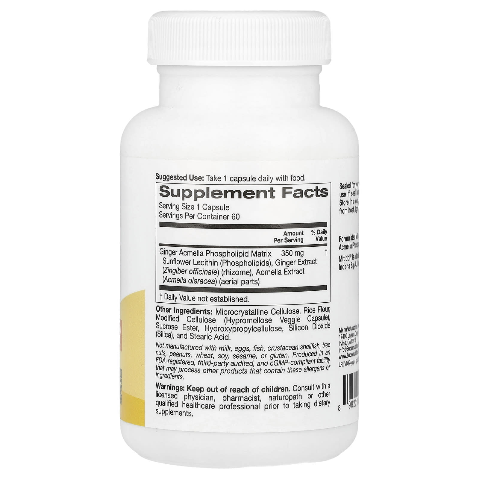 Фосфолипидная матрица с имбирём и акмеллой от Super Nutrition® содержит Mitidol®, разумную комбинацию растений акмеллы огородной (Acmella oleracea) и имбиря (Zingiber officinale), которые действуют вместе, обеспечивая эффективную поддержку при боли.