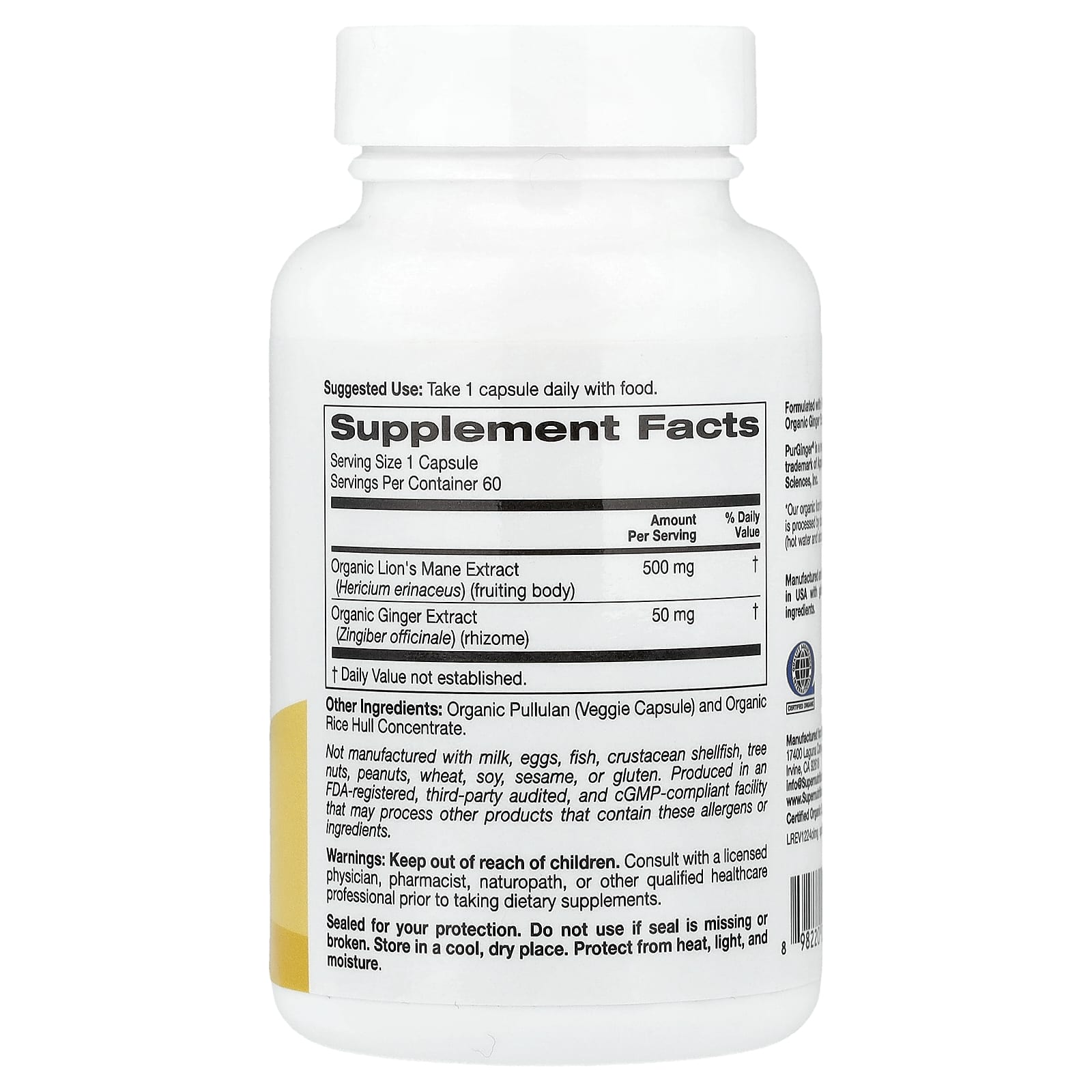 При производстве не используются молоко, яйца, рыба, моллюсков и ракообразных, древесные орехи, арахис, пшеница, сои, кунжут, глютен. Произведено на предприятии, имеющем регистрацию Управления по контролю качества пищевых продуктов и лекарственных средств США, которое проходит независимые проверки, имеет регистрацию текущей надлежащей производственной практики (cGMP), и где также могут обрабатываться другие продукты, содержащие эти аллергены или ингредиенты.
