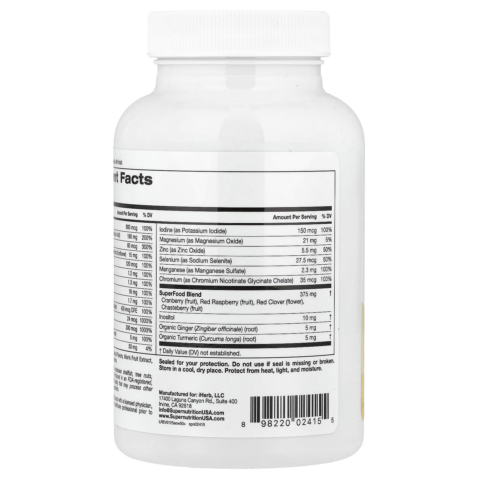 Мультивитамины и поддерживающие травы для женщин старше 50 лет SimplyOne® от Super Nutrition® для ежедневного приёма содержат мощные питательные вещества, удовлетворяющие уникальные потребности женщин старше 50 лет в здоровье. В состав добавки входят множество витаминов и минералов, в том числе витамины A, B6, B12, C, D и E, а также биотин, цинк, магний и многие другие. Кроме того, наша формула включает смесь суперфудов, инозитол, корень имбиря и куркуму. Вместе эти ингредиенты способствуют здоровому образу жизни*.