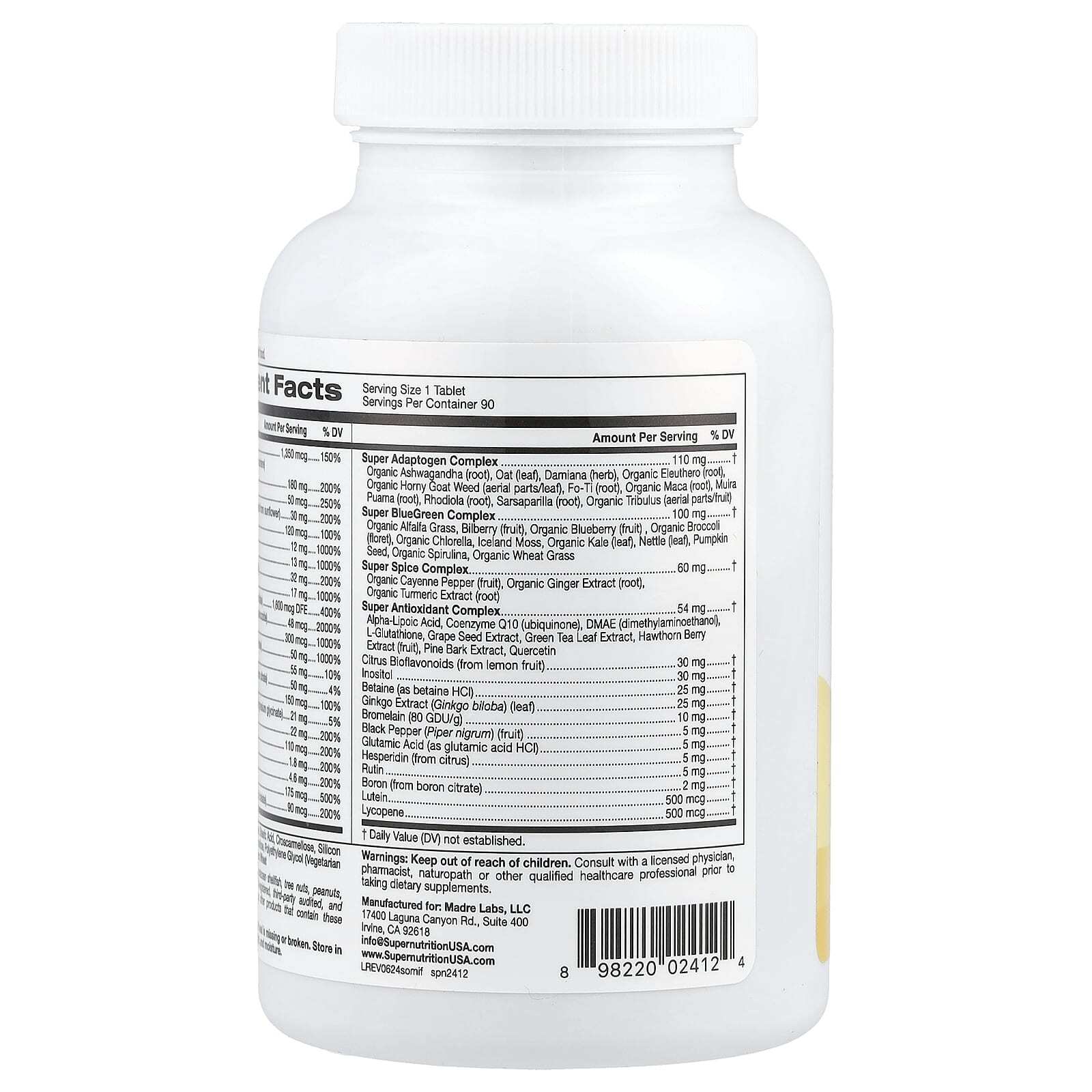 Витамин A (75% в виде ретинилпальмитата и 25% в виде бета-каротина), витамин С (в виде аскорбиновой кислоты), витамин D (в виде витамина D3, холекальциферол), Витамин E (в виде d-альфа-токоферил сукцината из подсолнечника), витамин K (в виде витамина K1, фитонадиона), Тиамин (в виде тиамина гидрохлорида), Рибофлавин, ниацин (в виде никотиновой кислоты и никотинамида), Витамин B6 (в виде пиридоксаль-5-фосфата), Фолат (в виде 5-МТГФ, L-5-метилтетрагидрофолат), Витамин B12 (в виде метилкобаламина и дибенкозида), Биотин (в виде d-биотина), пантотеновая кислота (в виде d-пантотената кальция), холин (в виде холина битартрата), кальций (в виде карбоната кальция и цитрата кальция), йод (из бурых водорослей), Магний (в виде оксида магния и глицината магния), Цинк (в виде цитрата цинка), Селен (в виде селенита натрия), медь (в виде глицината меди), марганец (в виде сульфата марганца), хром (в виде пиколината хрома), Молибден (в виде аминокислотного хелата молибдена), Комплекс супер адаптогенов: Органическая ашваганда (корень), Овес (лист), Дамиана (трава), Органический элеутерококк (корень), Органический козий рог (надземные части / листья), Fo-Ti (корень), Органическая мака (корень), Муира Пуама (корень), Родиола (корень), Сарсапариль (корень), Органические якорцы (надземные части / плоды); Комплекс Super BlueGreen: органические ростки люцерны, Черника (плоды), Органическая голубика (плод) , Органическая брокколи, (цветочек), органическая хлорелла, исландский мох, Органическая капуста (лист), Крапива (лист), Тыква, Семена, Органическая спирулина, органические ростки пшеницы; Комплекс супер специй: Органический кайенский перец (плоды), Органический экстракт имбиря (корень), Органический экстракт куркумы (корень); Супер антиоксидантный комплекс: альфа-липоевая кислота, Коэнзим Q10 (убихинон), ДМАЭ (диметиламиноэтанол), L-глутатион, Экстракт виноградных косточек, Экстракт листьев зеленого чая, Экстракт ягод боярышника (плоды), экстракт сосновой коры, Кверцетин; Цитрусовые биофлавоноиды (из плодов лимона), инозитол., бетаин (в виде гидрохлорида бетаина), Экстракт гинкго билоба (Ginkgo biloba) (лист), бромелаин (80 GDU/г), Плоды черного перца (Piper nigrum), глутаминовая кислота (в виде гидрохлорида глутаминовой кислоты), гесперидин (из цитрусов), рутин, бор (из цитрата бора), Лютеин, Ликопин