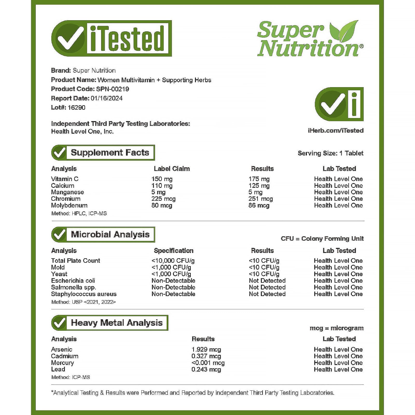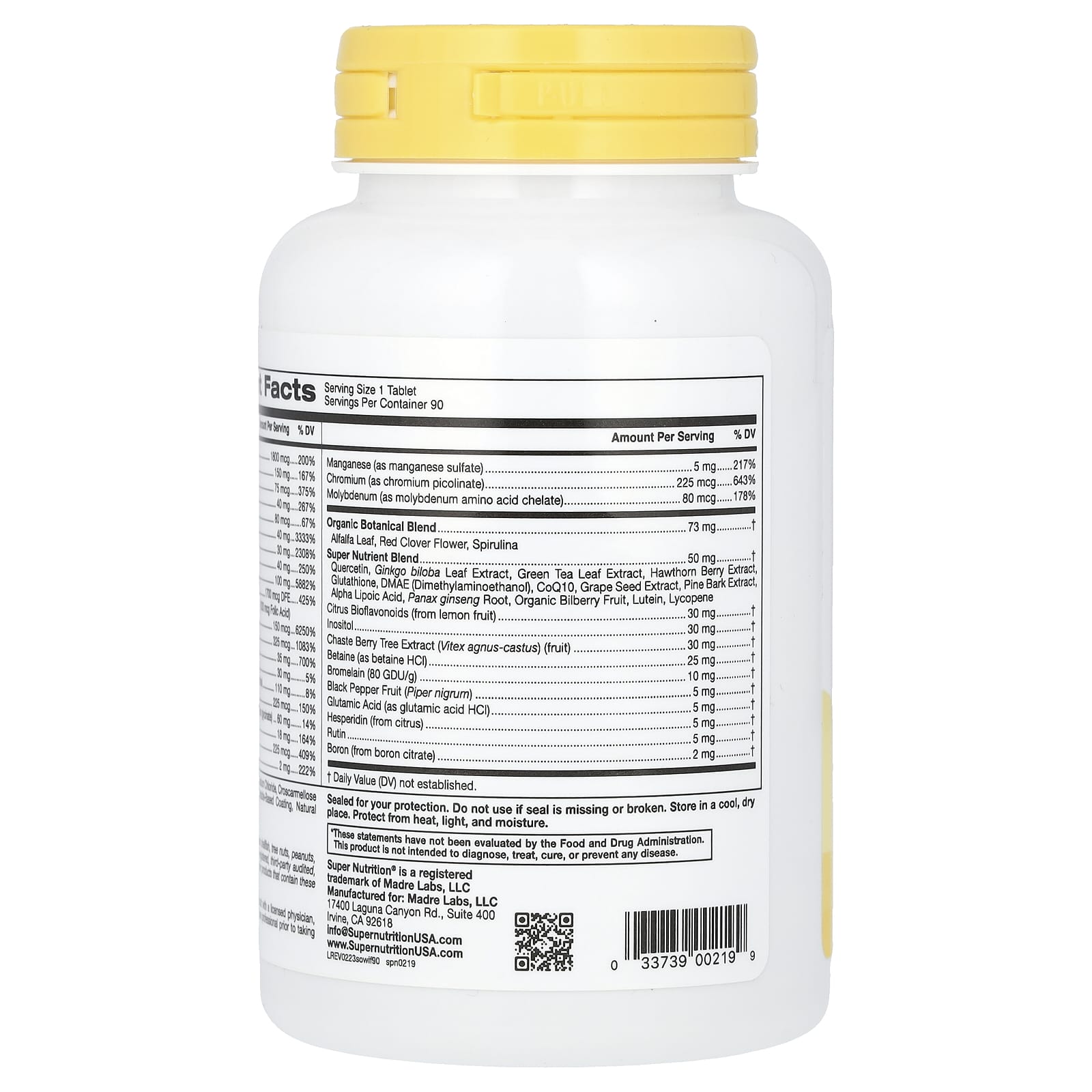 Витамин A (в виде ретинилпальмитата), витамин C (в виде аскорбиновой кислоты), витамин D (в виде витамина D3, холекальциферола), витамин E (в виде d-альфа токоферил сукцината), витамин K (в виде витамина K1, фитонадиона), тиамин (в виде тиамина гидрохлорида), рибофлавин, ниацин (в виде никотиновой кислоты и никотинамида), витамин B6 (в виде пиридоксина гидрохлорида), фолат, витамин В12 (в виде метилкобаламина), биотин (в виде d-биотина), пантотеновая кислота (в виде d-пантотената кальция), холин (в виде битартрата холина), кальций (в виде карбоната кальция и цитрата кальция), йод (из бурых водорослей), магний (в виде оксида магния и глицината магния), цинк (в виде оксида цинка и цитрата цинка), селен (в виде селенита натрия), медь (в виде глицината меди), марганец (в виде сульфата марганца), хром (в виде пиколината хрома), молибден (в виде аминокислотного хелата молибдена), смесь органических растительных компонентов (листья органической люцерны, цветки органического красного клевера, спирулина), смесь суперпитательных веществ (кверцетин, экстракт листьев гинкго (Ginkgo biloba), экстракт листьев зеленого чая, экстракт ягод боярышника, глутатион, диметиламиноэтанол, коэнзим Q10, экстракт виноградных косточек, экстракт сосновой коры, альфа-липоевая кислота, корень женьшеня обыкновенного (Panax ginseng), листья органической черники, лютеин, ликопин), цитрусовые биофлавоноиды (из плодов лимона), инозитол, экстракт плодов витекса (Vitex agnus-castus), бетаин (в виде гидрохлорида бетаина), бромелаин (80 GDU/г), плоды черного перца (Piper nigrum), глутаминовая кислота (в виде гидрохлорида глутаминовой кислоты), гесперидин (из цитрусов), рутин, бор (из цитрата бора).