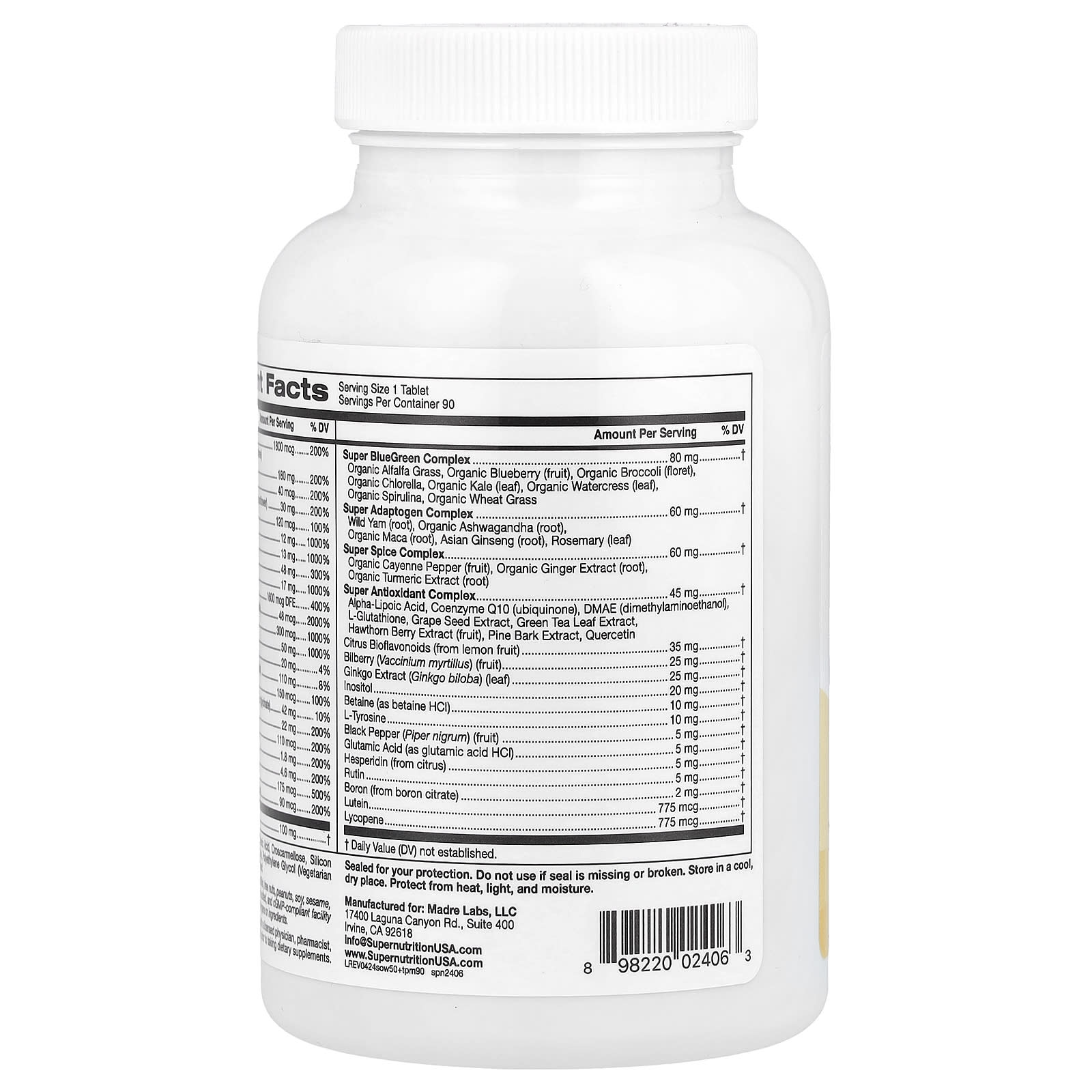 Витамин A (83% в виде ретинилпальмитата и 17% в виде бета-каротина), витамин C (в виде аскорбиновой кислоты), витамин D (в виде витамина D3, холекальциферол), Витамин E (в виде d-альфа-токоферил сукцината из подсолнечника), витамин K (в виде витамина K1, фитонадиона), Тиамин (в виде тиамина гидрохлорида), Рибофлавин, ниацин (в виде никотиновой кислоты и никотинамида), Витамин B6 (в виде пиридоксаль-5-фосфата), Фолат (в виде 5-МТГФ, L-5-метилтетрагидрофолат), Витамин B12 (в виде метилкобаламина и дибенкозида), Биотин (в виде d-биотина), пантотеновая кислота (в виде d-пантотената кальция), холин (в виде холина битартрата), кальций (в виде карбоната кальция и цитрата кальция), лодин (из бурых водорослей), Магний (в виде оксида магния и глицината магния), Цинк (в виде цитрата цинка), Селен (в виде селенита натрия), медь (в виде глицината меди), марганец (в виде сульфата марганца), хром (в виде пиколината хрома), Молибден (в виде аминокислотного хелата молибдена), L-фенилаланин, Комплекс Super BlueGreen, Комплекс супер адаптогенов, Комплекс супер специй, Супер антиоксидантный комплекс, цитрусовые биофлавоноиды (из плодов лимона), Черника (Vaccinium myrtillus) (плоды), Экстракт гинкго билоба (Ginkgo biloba) (лист), инозитол., бетаин (в виде гидрохлорида бетаина), L-тирозин, Плоды черного перца (Piper nigrum), глутаминовая кислота (в виде гидрохлорида глутаминовой кислоты), гесперидин (из цитрусовых), рутин, бор (из цитрата бора), Лютеин, Ликопин