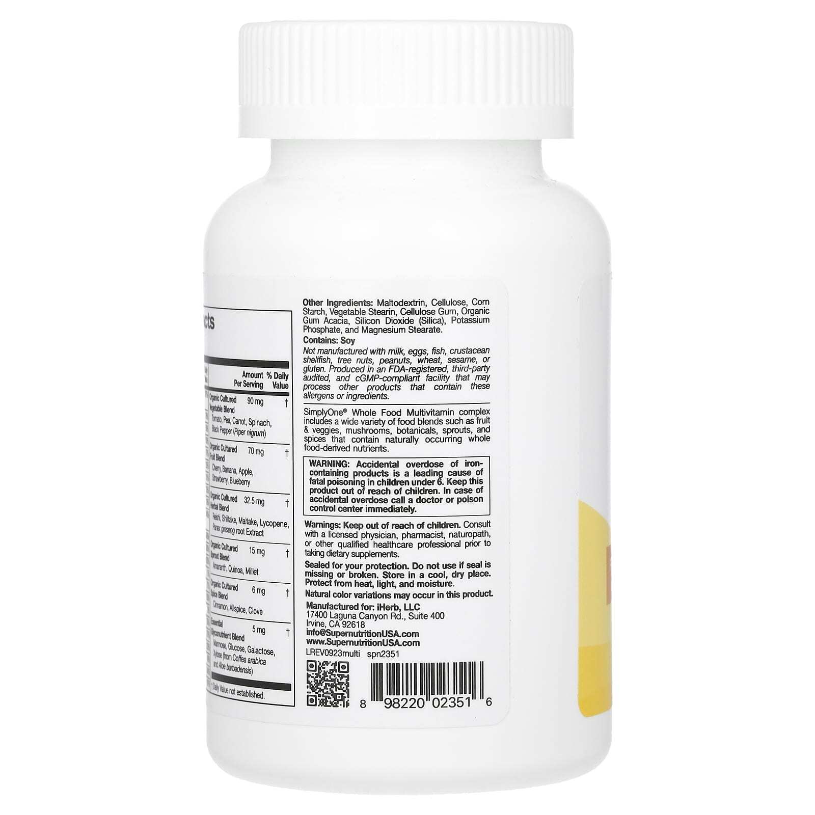 Цельнопищевые мультивитамины SimplyOne® от Super Nutrition® — необходимая добавка, которая поможет устранить дефицит питательных веществ. Это удобный и биодоступный источник незаменимых витаминов и минералов, необходимых вам ежедневно, включая витамины А и С, а также минералы, такие как кальций, железо и цинк. Кроме того, добавка содержит природные питательные вещества, ферменты, фитохимические вещества и другие кофакторы в биодоступной форме, которую организм может эффективно переваривать и усваивать. Наша формула также содержит ликопин, женьшень, грибы рейши, шиитаке и гриб-баран.