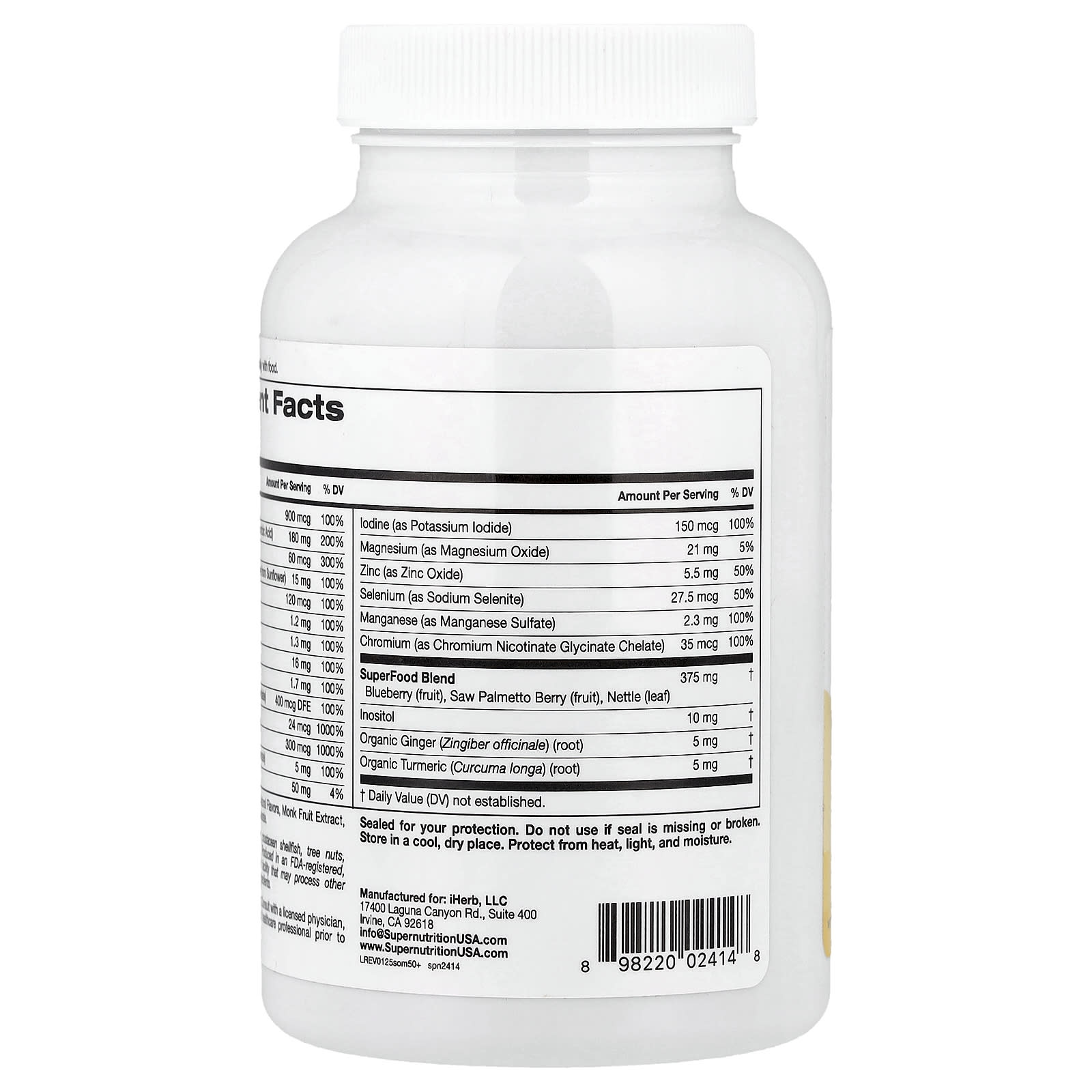 Витамин A (в виде ретинилпальмитата), Витамин С (в виде аскорбата натрия и аскорбиновой кислоты), витамин D (в виде витамина D3, холекальциферола), Витамин E (в виде d-альфа токоферил сукцината из подсолнечника), витамин K (в виде витамина K1, фитонадиона), тиамин (в виде тиамина гидрохлорида), Рибофлавин, ниацин (в виде никотинамида), Витамин B6 (в виде пиридоксина гидрохлорида), фолат (в виде 5-MTHF, L-5-метилтетрагидрофолата), Витамин В12 (в виде метилкобаламина), биотин (в виде d-биотина), Пантотеновая кислота (в виде d-пантотената кальция), Кальций (в виде карбоната кальция), Йод (в виде йодида калия), Магний (в виде оксида магния), Цинк (в виде оксида цинка), селен (в виде селенита натрия), Марганец (в виде сульфата марганца), Хром (в виде хелата глицината никотината хрома), смесь суперфудов: Голубика (плод), Ягоды серенои (плоды), крапива (листья); Инозитол, Органический имбирь аптечный (Zingiber officinale) (корень), Органическая куркума (curcuma longa) (корень)