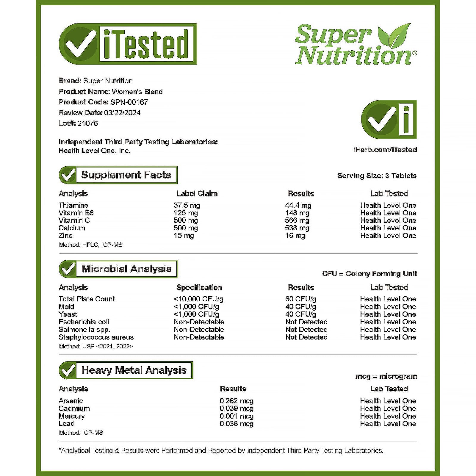 Смесь для женщин от Super Nutrition®содержит дневную дозу витаминов и мощные питательные вещества, предназначенные для удовлетворения уникальных потребностей женского организма. Она содержит множество витаминов и минералов, в том числе витамины A, B6, B12, C, D и E, а также биотин, цинк, магний и многие другие. Кроме того, наша формула содержит сбалансированную растительную смесь с полезными экстрактами трав, такими как ягоды витекса священного, калина обыкновенная, пион, дикий ямс и другие. В комплексе эти ингредиенты способствуют здоровому образу жизни*.