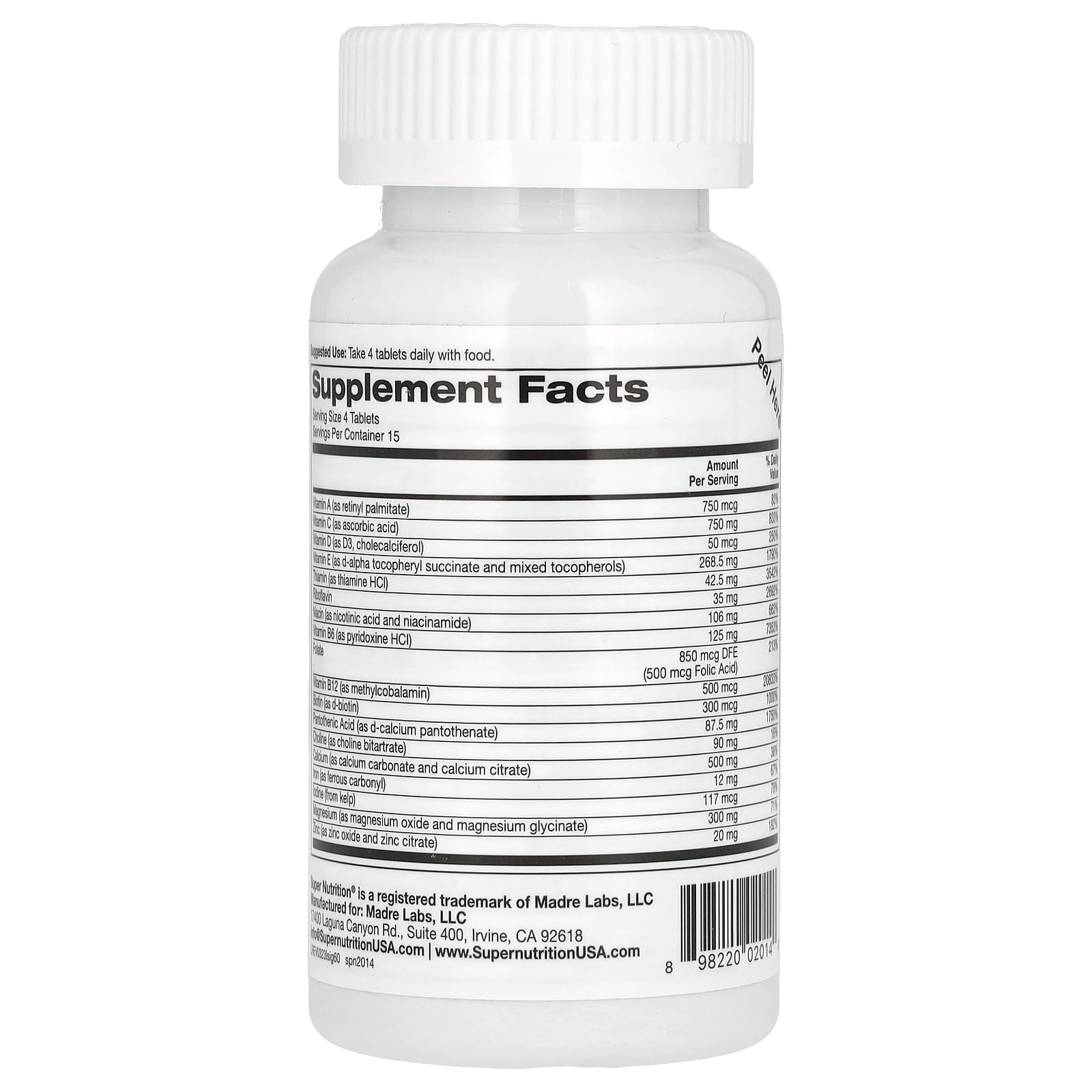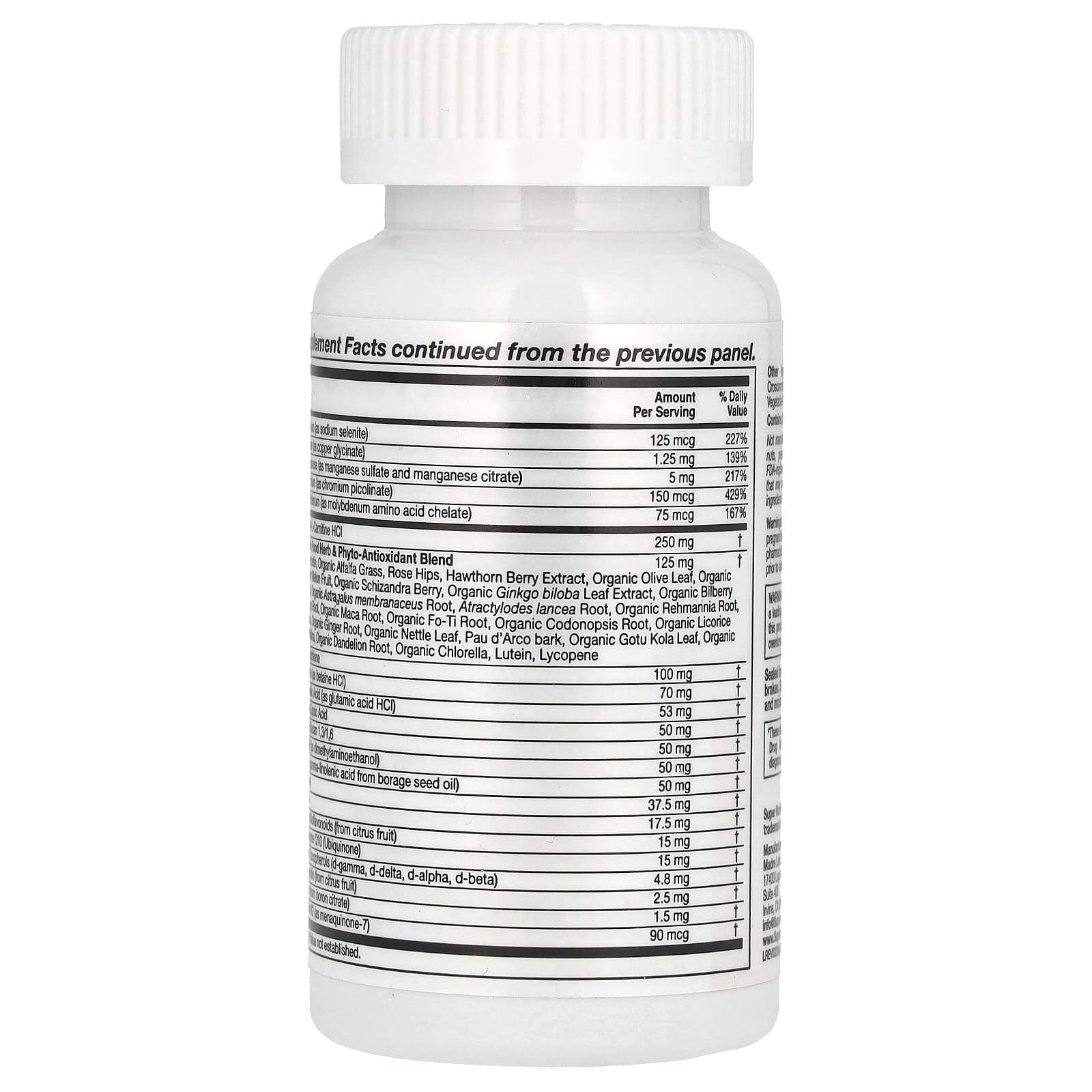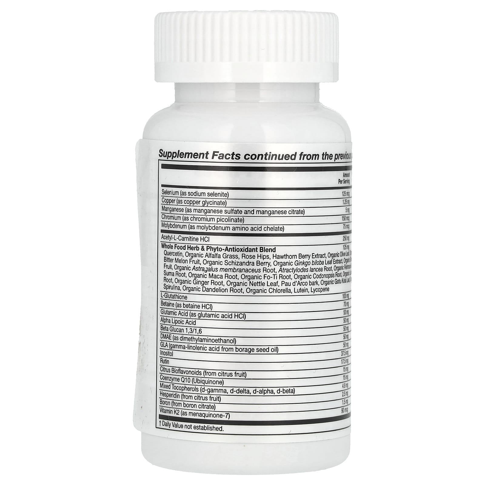 Витамин A (в виде ретинилпальмитата), витамин C (в виде аскорбиновой кислоты), витамин D (в виде витамина D3, холекальциферола), витамин E (в виде d-альфа-токоферил сукцината и смешанных токоферолов), витамин K (в виде K2, менахинона-7), тиамин (в виде тиамина гидрохлорида), рибофлавин, ниацин (в виде никотиновой кислоты и никотинамида), витамин B6 (в виде пиридоксина гидрохлорида), фолат, витамин В12 (в виде метилкобаламина), биотин (в виде d-биотина), пантотеновая кислота (в виде d-пантотената кальция), холин (в виде холина битартрата), кальций (в виде карбоната кальция и цитрата кальция), железо (в виде карбонила железа), йод (из бурых водорослей), магний (в виде оксида магния и глицината магния), цинк (в виде оксида цинка и цитрата цинка), селен (в виде селенита натрия), медь (в виде глицината меди), марганец (в виде сульфата марганца и цитрата марганца), хром (в виде пиколината хрома), молибден (в виде аминокислотного хелата молибдена), ацетил-L-карнитина гидрохлорид, L-глутатион, бетаин (в виде бетаина гидрохлорида), глутаминовая кислота (в виде гидрохлорида глутаминовой кислоты), альфа-липоевая кислота, бета-глюкан (1,3/1,6), ДМАЭ (в виде диметиламиноэтанола), ГЛК (гамма-линоленовая кислота из масла из семян бурачника), инозитол, рутин, цитрусовые биофлавоноиды (из плодов лимона), коэнзим Q10 (убихинон), смешанные токоферолы (d-гамма, d-дельта, d-альфа, d-бета), гесперидин (из цитрусовых), бор (из цитрата бора), смесь цельнопищевых растений и фитоантиоксидантов: кверцетин, органические ростки люцерны, шиповник, экстракт ягод боярышника, лист органического оливкового дерева, плоды органической китайской горькой тыквы, органические ягоды лимонника, экстракт листьев органического гинкго, плоды органической черники, корень органического астрагала перепончатого (Astragalus membranaceus), экстракт корня атрактилодеса (Atractyloides Lancea), корень органической ремании, корень сумы, корень органической маки, корень органического горца многоцветкового, корень органического кодонопсиса, корень органической солодки, корень органического имбиря, листья органической крапивы, кора муравьиного дерева, листья органической готу колы, органическая спирулина, корень органического одуванчика, органическая хлорелла, лютеин, ликопин.