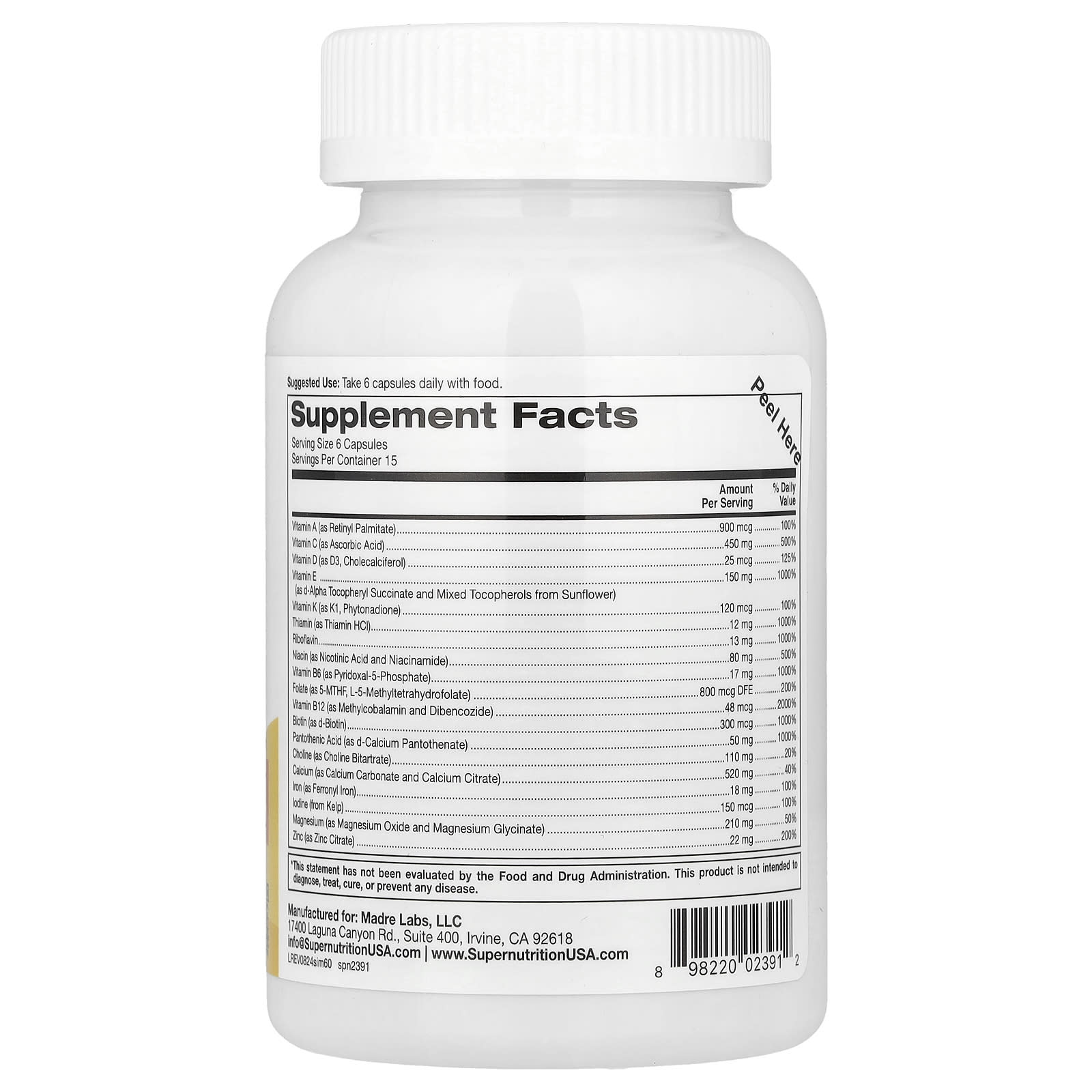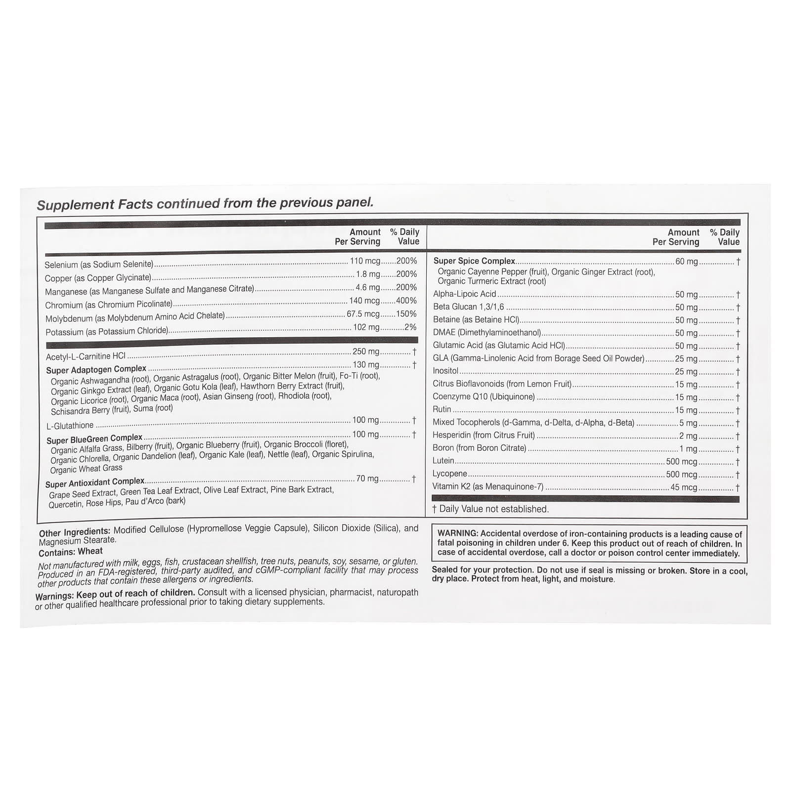 Витамин A (в виде ретинилпальмитата), витамин С (в виде аскорбиновой кислоты), витамин D (в виде витамина D3, холекальциферола), Витамин E (в виде d-альфа токоферил сукцината и смешанных токоферолов из подсолнечника) Витамин K (в виде K1, Фитонадион), Тиамин (в виде тиамина гидрохлорида), Рибофлавин, ниацин (в виде никотинамида и никотиновой кислоты), Витамин B6 (в виде пиридоксаль-5-фосфата), Фолат (в виде 5-МТГФ, L-5-метилтетрагидрофолат), Витамин B12 (в виде метилкобаламина и дибенкозида), Биотин (в виде d-биотина), пантотеновая кислота (в виде d-пантотената кальция), Холин (в виде битартрата холина), Кальций (в виде карбоната кальция и цитрата кальция), Железо (в виде ферронила), Йод (из бурых водорослей), Магний (в виде оксида магния и глицината магния), цинк (в виде цитрата цинка), селен (в виде селенита натрия), Медь (в виде глицината меди), Марганец (в виде сульфата марганца и цитрата марганца), Хром (в виде пиколината хрома), Молибден (в виде аминокислотного хелата молибдена), Калий (в виде хлорида калия), Ацетил-L-карнитин гидрохлорид, комплекс супер адаптогенов: Органическая ашваганда (корень), Органический астрагал (корень), Органическая горькая дыня (плоды), Fo-Ti (корень), Органический экстракт гинкго (лист), Органический готу кола (лист), Экстракт ягод боярышника (плоды), Органическая солодка (корень), Органическая мака (корень), Азиатский женьшень (корень), Родиола (корень), Ягоды лимонника (плоды), Сума (корень); L-глутатион, комплекс Super BlueGreen: органические ростки люцерны, Черника (плоды), Органическая голубика (плод), Органическая брокколи (соцветия), органическая хлорелла, Органический одуванчик (лист), Органическая капуста (лист), Крапива (лист), органическая спирулина, Органические ростки пшеницы; Супер антиоксидантный комплекс: Экстракт виноградных косточек, Экстракт листьев зеленого чая, Экстракт оливковых листьев, экстракт сосновой коры, Кверцетин, шиповник, Пау д'Арко (кора); Комплекс супер специй: Органический кайенский перец (плоды), Органический экстракт имбиря (корень), Органический экстракт куркумы (корень); Альфа-липоевая кислота, бета-глюкан (1,3/1,6), Бетаин (в виде бетаина гидрохлорида), диметиламиноэтанол (ДМАЭ), Глутаминовая кислота (в виде глутаминовой кислоты HCl), ГЛК (гамма-линоленовая кислота из порошка масла семян бурачника), инозитол., Цитрусовые биофлавоноиды (из плодов лимона), Коэнзим Q10 (убихинон), рутин, Смешанные токоферолы (d-гамма, d-дельта, d-альфа, d-бета), Гесперидин (из цитрусовых), Бор (из цитрата бора), Лютеин, Ликопин, витамин K2 (в виде менахинона-7).