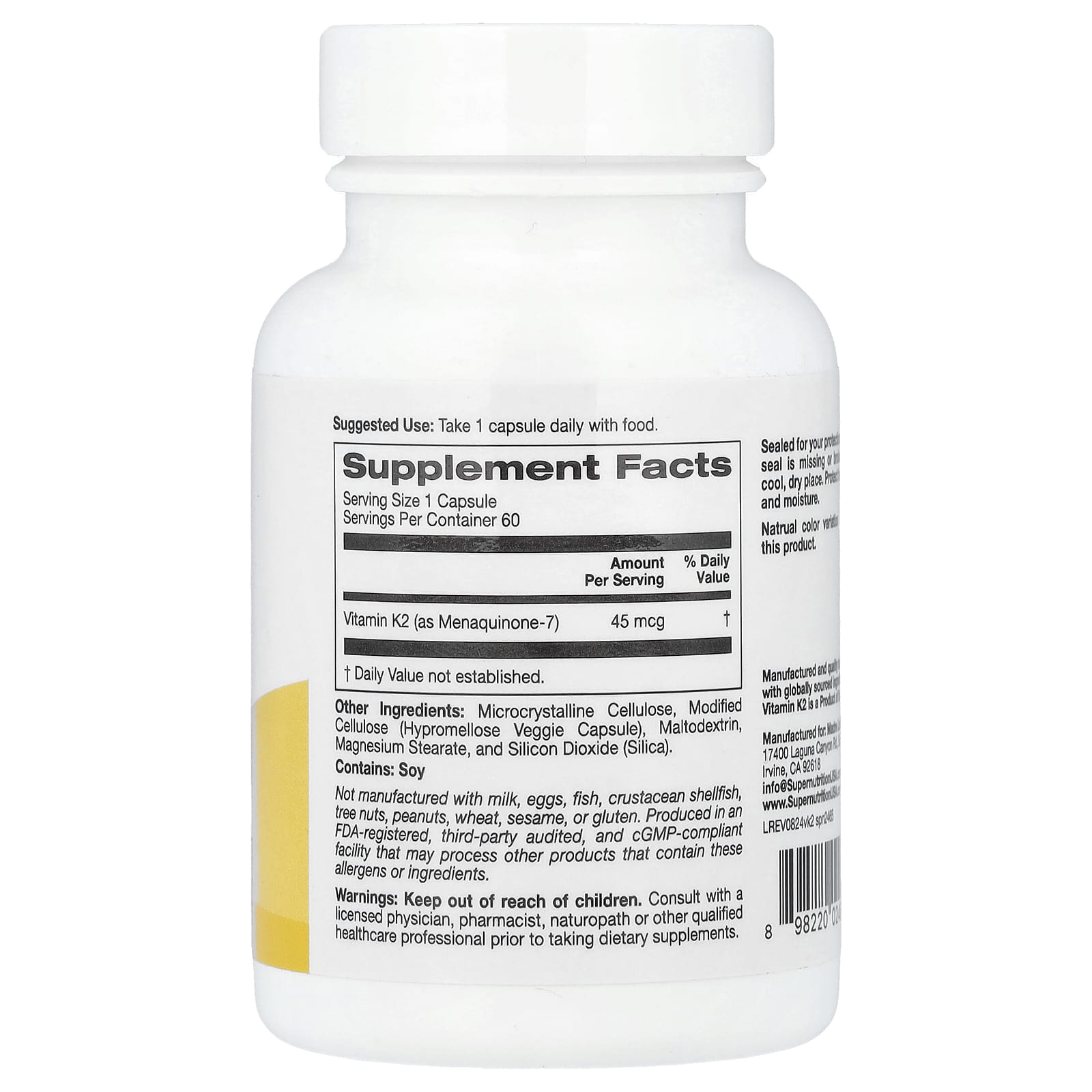 Витамин K2 от Super Nutrition® создан на основе витамина K2 класса USP (vitaMK7®), произведённого в Италии с применением натурального процесса ферментации. Как часть семейства витамина K, это жирорастворимое соединение поддерживает здоровье костей и выполняет антиоксидантные функции. Витамин K2 помогает поддерживать прочность костей на всех этапах развития. Он предлагается в биодоступной форме (менахинон-7) в виде удобных растительных капсул.