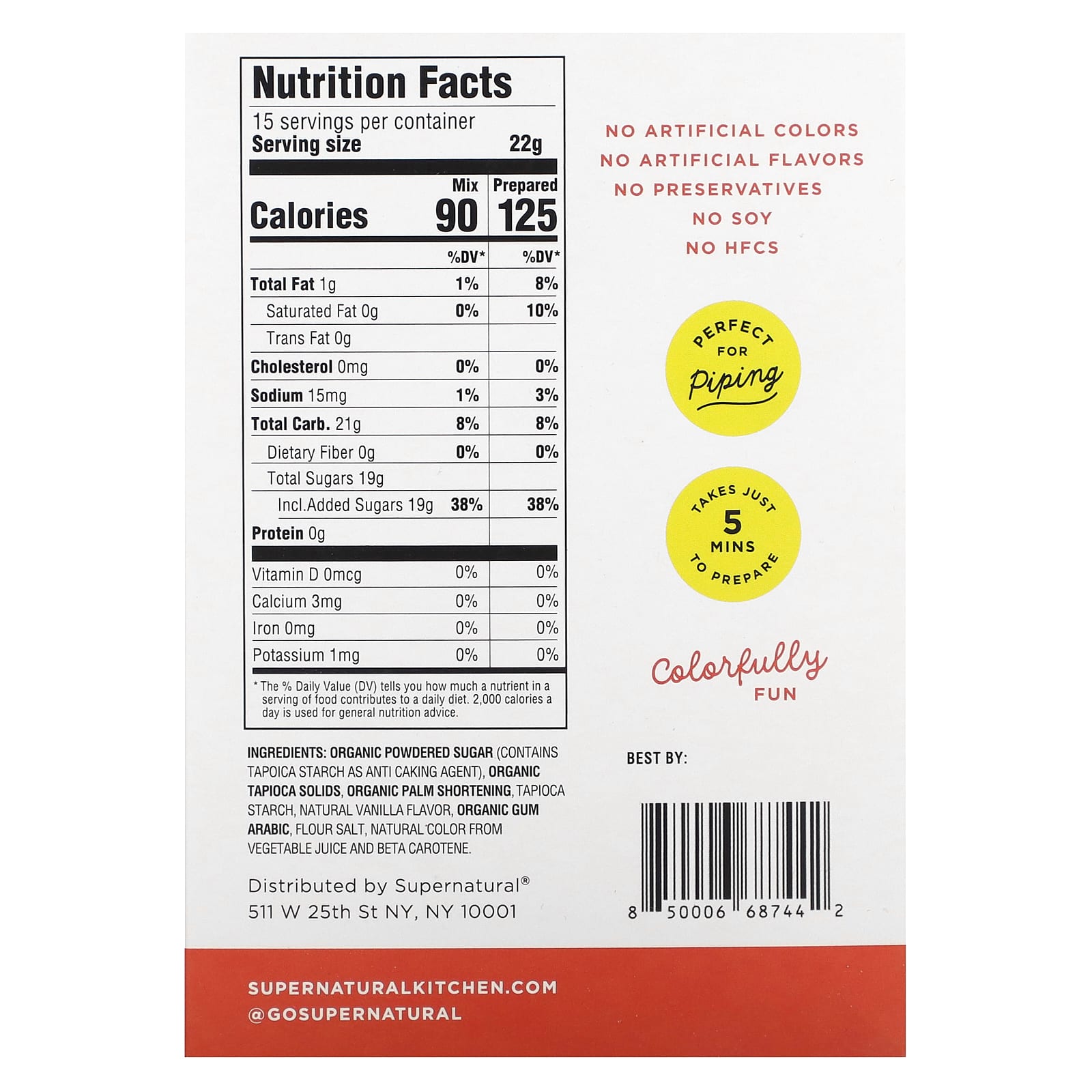 Органическая сахарная пудра (содержит тапиоковый крахмал в качестве агента, препятствующего слеживанию), органические твердые вещества тапиоки, органическое пальмовое масло, тапиоковый крахмал, натуральный ароматизатор «Ваниль», органическая аравийская камедь, мучная соль, натуральный краситель из овощного сока и бета-каротина.