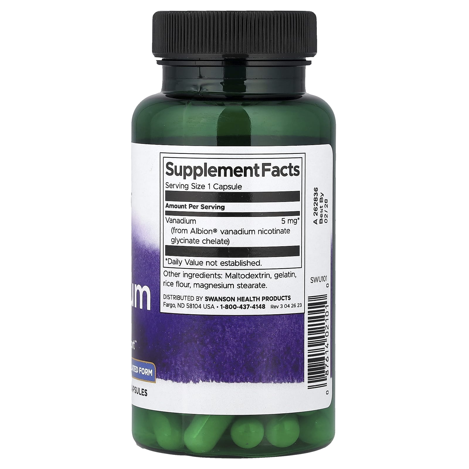 Ванадий Swanson помогает поддерживать здоровый углеводный обмен. Каждая капсула классифицируется как микроэлемент, поскольку необходима только в небольших количествах. Каждая капсула содержит 5 мг хелатного ванадия от Albion, лидера в области дополнительных минеральных хелатов.