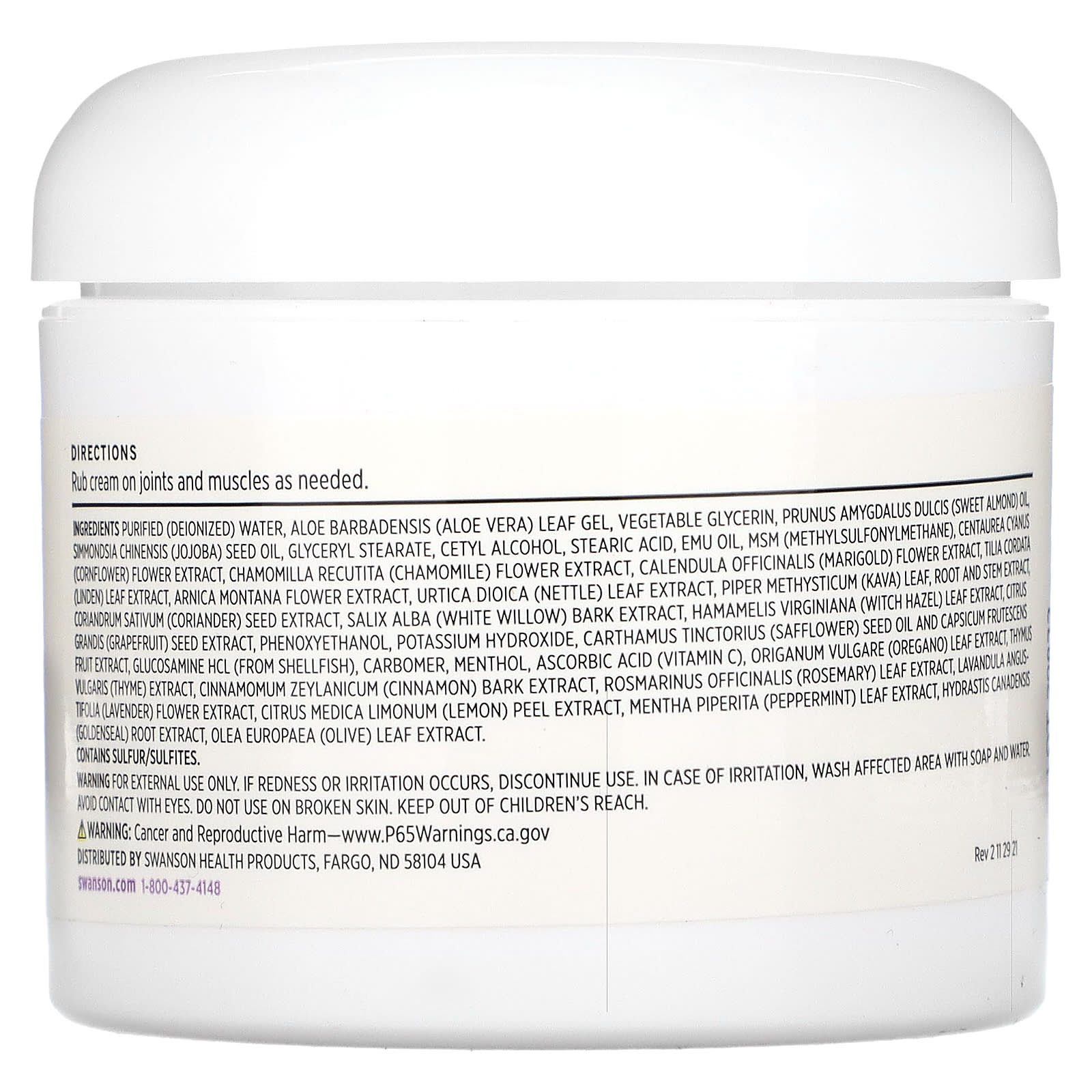 Очищенная (деионизированная) вода, гель из листьев алоэ вера, растительный глицерин, Prunus amygdalus dulcis (масло сладкого миндаля, масло семян жожоба (Simmondsia chinensis), глицерил стеарат, цетиловый спирт, стеариновая кислота, эму масло, метилсульфонилметан (МСМ), василек (Centaurea cyanus), экстракт цветков, экстракт цветков ромашки (Chamomilla recutita), экстракт цветков календулы (Calendula officinalis), экстракт листьев липы (Tilia cordata), экстракт цветков арники (Arnica montana), экстракт листьев крапивы двудомной (Urtica dioica), листья кава (Piper methysticum), экстракт корня и стебля, экстракт семян кориандра (Coriandrum sativum), экстракт коры ивы белой (Salix alba), экстракт листьев гамамелиса (Hamamelis virginiana), экстракт семян грейпфрута (Citrus grandis), феноксиэтанол, гидроксид калия, масло семян сафлора (Carthamus tinctorius) и экстракт плодов стручкового перца, глюкозамин гидрохлорид (из моллюсков), карбомер, ментол, аскорбиновая кислота (витамин C), экстракт листьев орегано (Origanum vulgare), экстракт чабреца (Thymus vulgaris), экстракт коры корицы (Cinnamomum zeylanicum), экстракт листьев розмарина (Rosmarinus officinalis), экстракт цветков лаванды (Lavandula angustifolia), экстракт цедры лимона (Citrus medica limonum), экстракт листьев перечной мяты (Mentha piperita), экстракт корня желтокорня (Hydrastis canadensis), экстракт листьев оливкового дерева (Olea europaea).