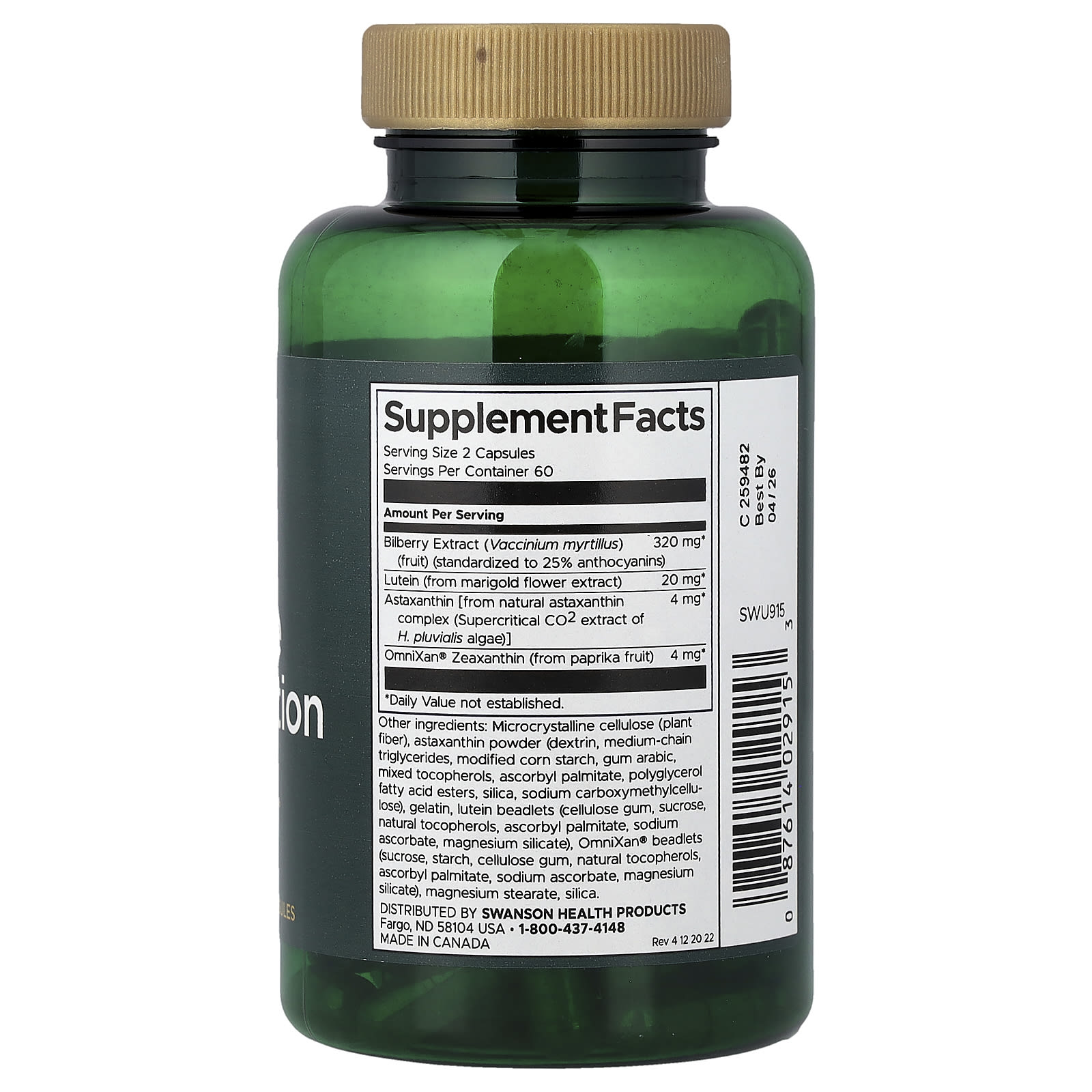Микрокристаллическая целлюлоза (растительная клетчатка), астаксантин в порошке (декстрин, среднецепочечные триглицериды, модифицированный кукурузный крахмал, аравийская камедь, смешанные токоферолы, аскорбил пальмитат, эфиры полиглицериловых жирных кислот, диоксид кремния, карбоксиметилцеллюлоза натрия), желатин, гранулы лютеина (целлюлозная камедь, сахароза, натуральные токоферолы, аскорбил пальмитат, аскорбат натрия, силикат магния), Гранулы OmniXan® (сахароза, крахмала, целлюлозная камедь, натуральные токоферолы, аскорбил пальмитат, аскорбат натрия, силикат магния), стеарат магния, диоксид кремния.