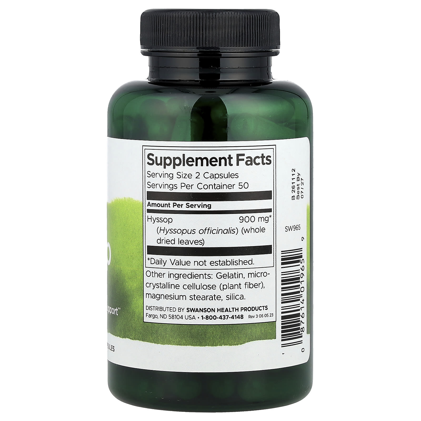 Вечнозеленое многолетнее растение, произрастающее в Южной Европе и Центральной Азии, иссоп Swanson обладает полезными свойствами для всего организма. Иссоп является прекрасным тонизирующим средством для здоровья и поддерживает работу пищеварительной системы. Каждая порция из двух капсул содержит 900 мг порошка иссопа.