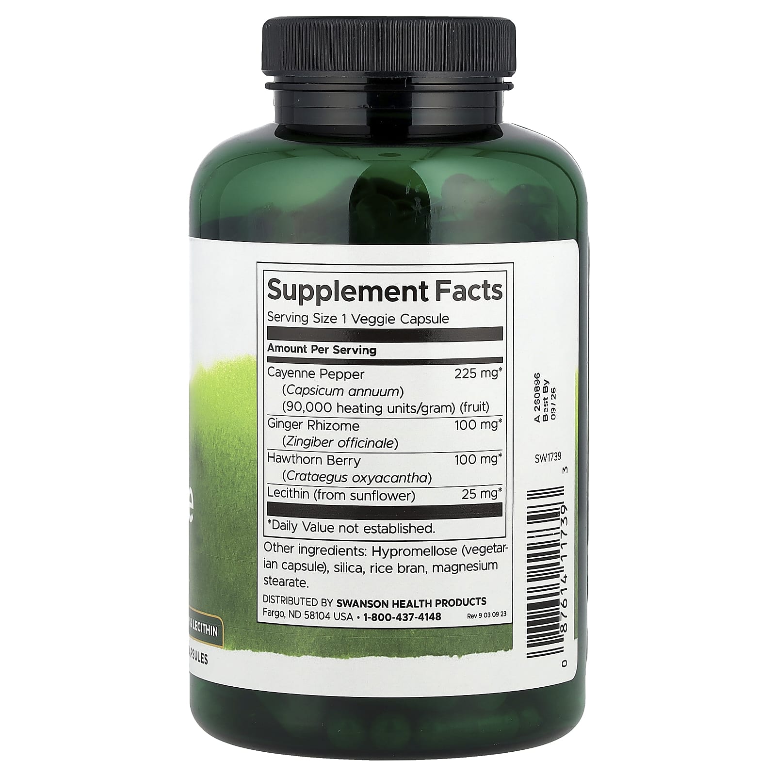 Кайенский перец - это не просто любимая специя в кулинарных блюдах. Добавка Swanson Super Cayenne помогает поддерживать здоровое кровообращение в организме, а также укрепляет здоровье сердечно-сосудистой системы. Эта специальная формула содержит 225 мг кайенского перца с корнем имбиря, ягодами боярышника и лецитином для мощной поддержки здоровья сердца.