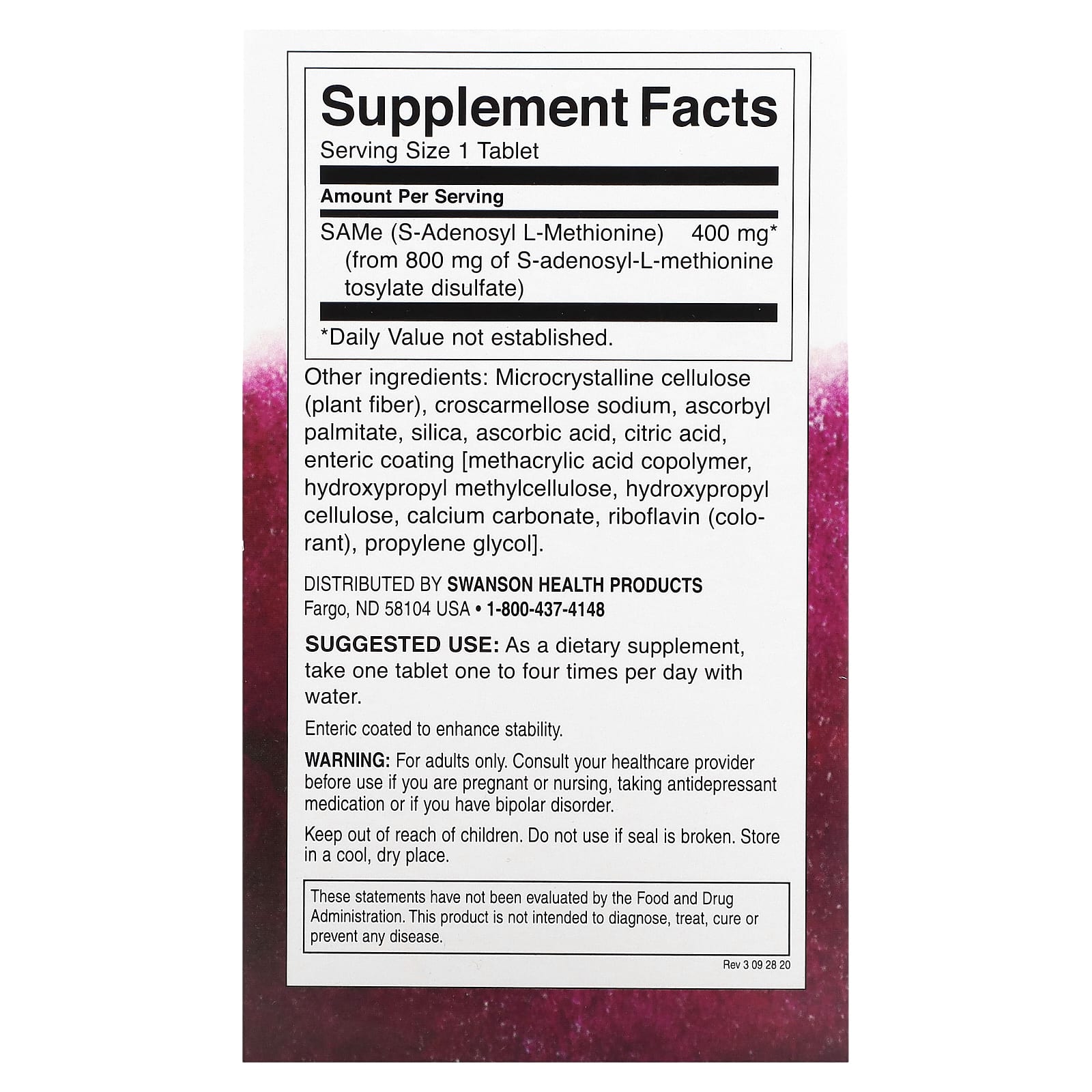 Swanson, SAMe, высокая эффективность, 400 мг, 30 таблеток