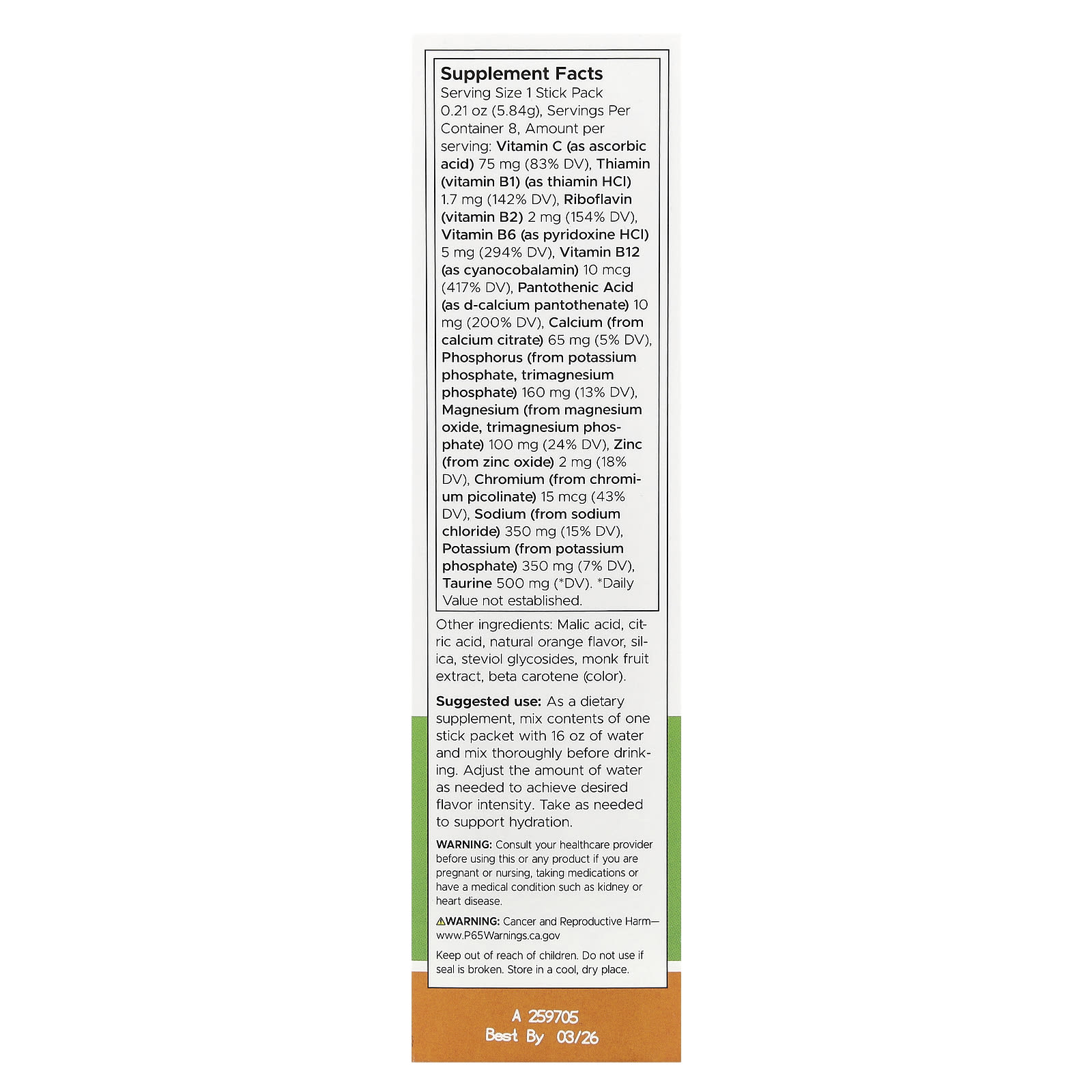 В качестве пищевой добавки смешайте содержимое одного стик-пакета с 480 мл (16 унциями) воды и тщательно перемешайте перед употреблением. Количество воды можно изменить по желанию, чтобы достичь желаемой интенсивности вкуса. Принимайте по мере необходимости, чтобы поддерживать водный баланс.