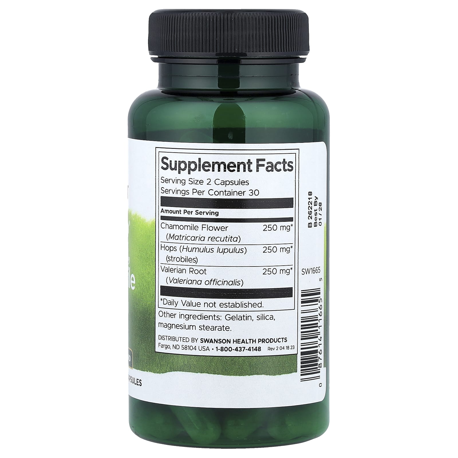 Компания Swanson предлагает вам три самых проверенных временем расслабляющих травы в мире, объединенных в одной успокаивающей формуле: валериана, ромашка и хмель. Корень валерианы способствует расслаблению, поэтому ваш разум может отдохнуть. Ромашка успокаивает и дарит ощущение комфорта. Хмель успокаивает и расслабляет. Это трио трав поможет вам расслабиться и расслабиться, в которых нуждаются разум и тело.