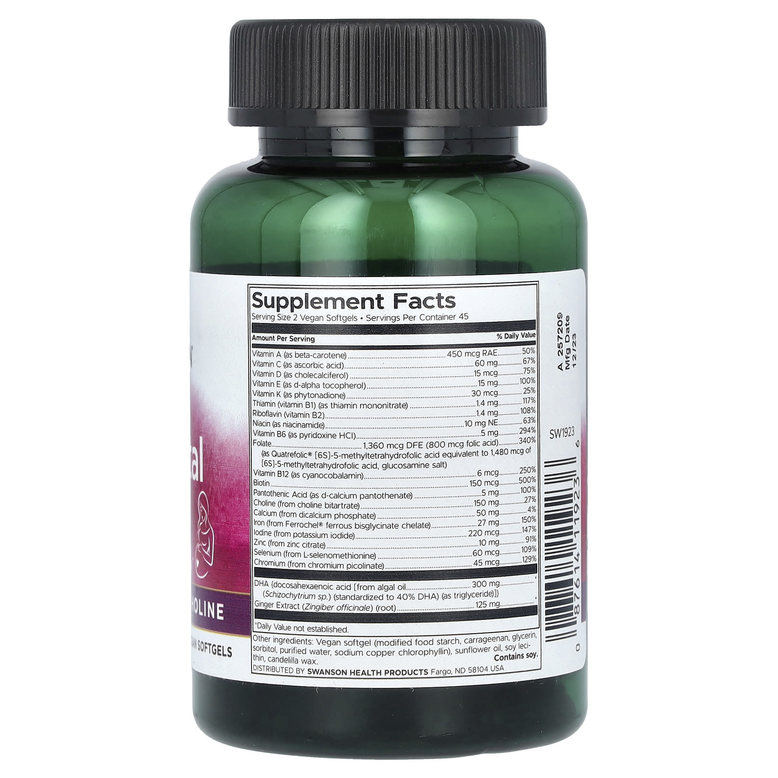 Веганский пренатальный мультивитаминный комплекс Swanson также содержит 300 мг веганской ДГК, полученной из масла водорослей, для поддержки здорового роста плода, а также экстракт корня имбиря, успокаивающий желудок. ДГК — это незаменимая жирная кислота омега-3, которая способствует развитию когнитивных функций, а также поддерживает здоровье глаз и сердца. Эта комплексная формула также содержит холин — минерал, который все больше узнают из-за его важности для здорового развития мозга во время беременности, а также для целостности клеточных мембран всего организма.