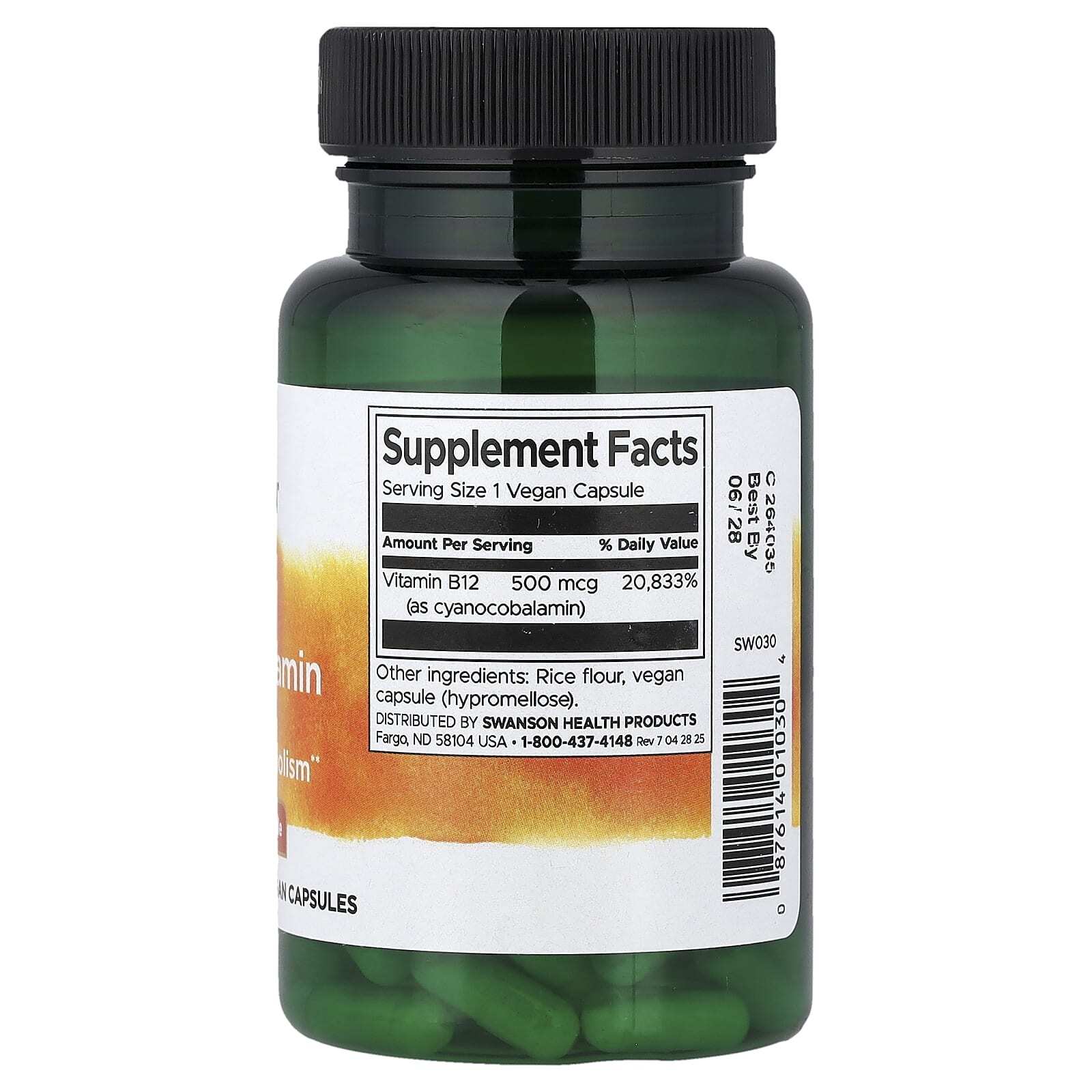 Swanson, витамин B12, 500 мкг, 100 веганских капсул
