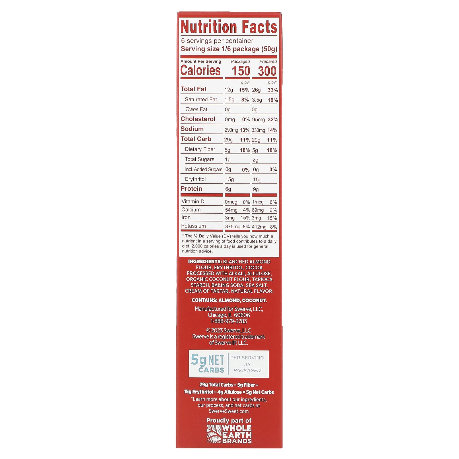 Бланшированная миндальная мука, эритритол, обработанное щелочью какао, аллюлоза, органическая кокосовая мука, тапиоковый крахмал, пищевая сода, морская соль, винный камень, натуральный ароматизатор.