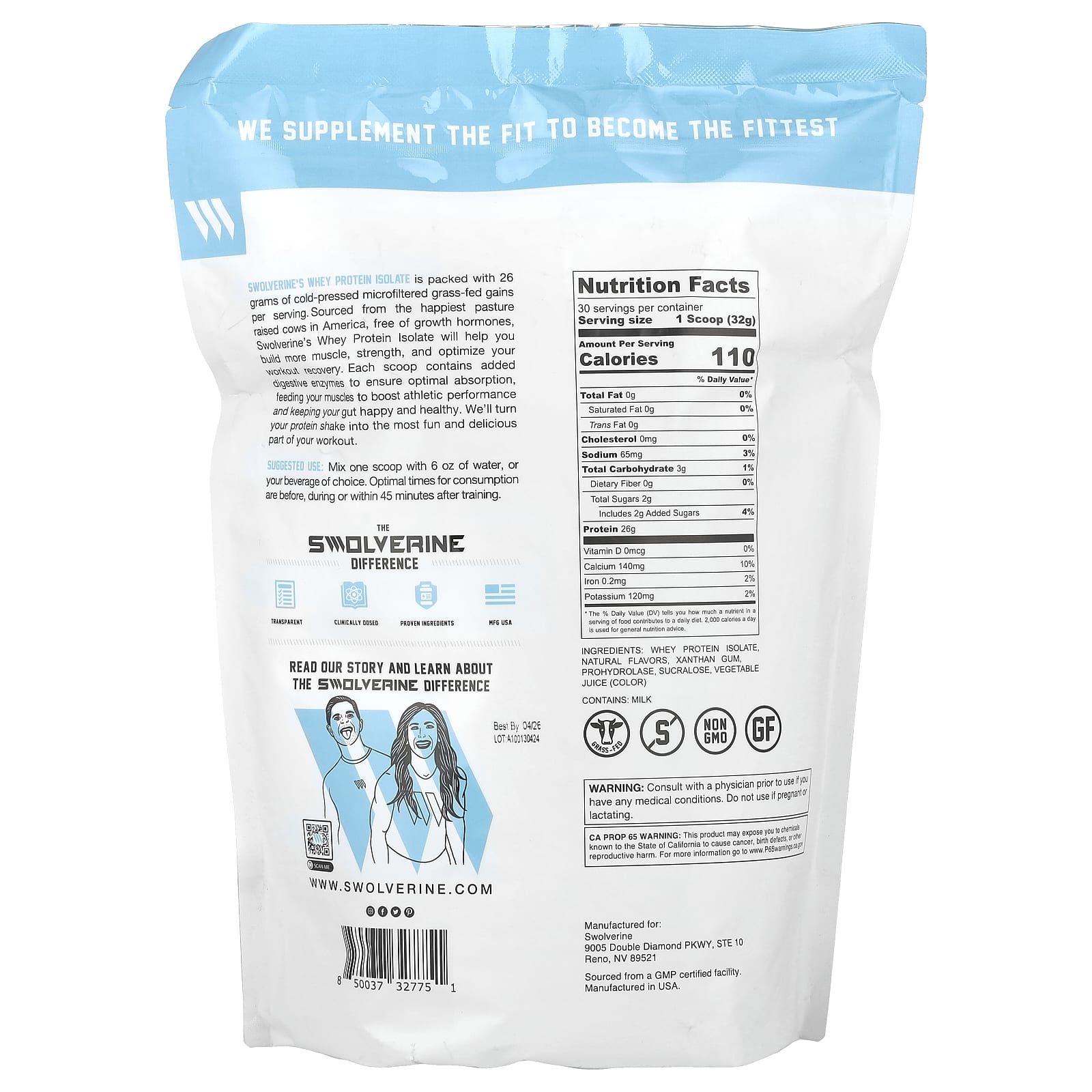 Swolverine's Whey Protein Isolate is packed with 26 grams of cold-pressed microfiltered grass-fed gains per serving. Sourced from the happiest pasture raised cows in America, free of growth hormones, Swolverine's Whey Protein Isolate will help you build more muscle, strength, and optimize your workout recovery. Each scoop contains added digestive enzymes to ensure optimal absorption, feeding your muscles to boost athletic performance and keeping your gut happy and healthy. We'll turn your protein shake into the most fun and delicious part of your workout.