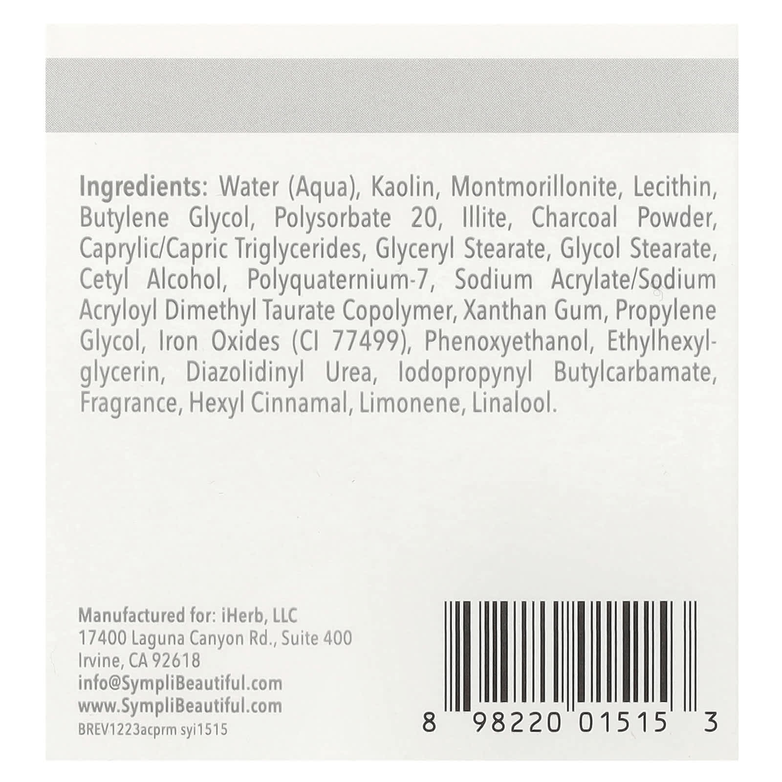 Вода (Aqua), Каолин, Монтмориллонит, Лецитин, Бутиленгликоль, Полисорбат 20, Иллит, Древесный уголь, Каприловые / каприновые триглицериды, Глицерил стеарат, Стеарат гликоля, Цетиловый спирт, Поликватерниум-7, Акрилат натрия / сополимер акрилоил диметилтаурата натрия, Ксантановая камедь, Пропиленгликоль, Оксиды железа (CI 77499), Феноксиэтанол, Этилгексилглицерин, Диазолидинил мочевина, лодопропинил бутилкарбамат, Отдушка, Гексил циннамал, Лимонен, Линалоол.