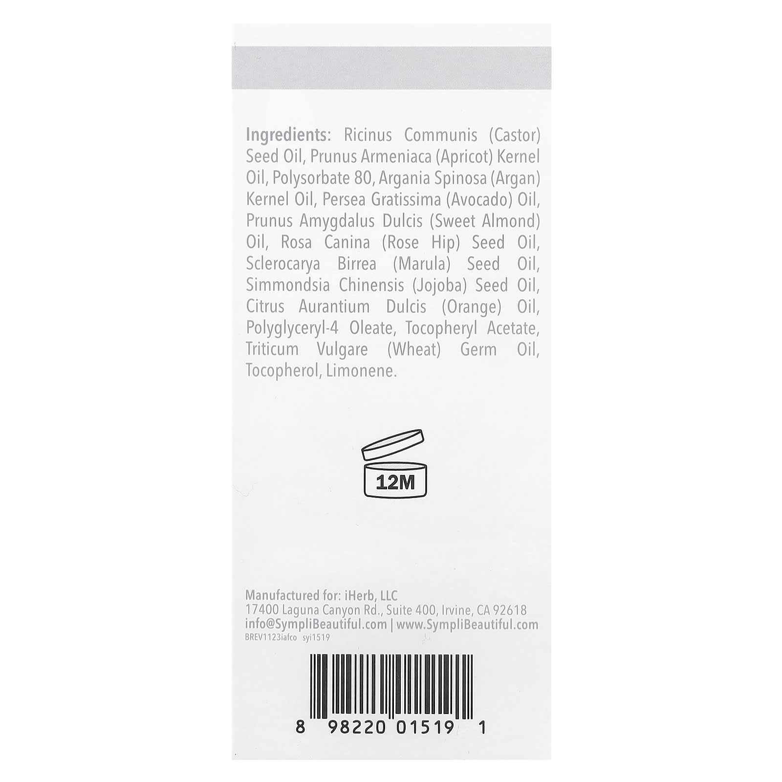 Касторовое масло (Ricinus communis), масло из косточек абрикоса (Prunus armeniaca), полисорбат 80, масло из ядер арганы (Argania spinosa), масло авокадо (Persea gratissima), масло сладкого миндаля (Prunus amygdalus dulcis), масло из семян шиповника (Rosa canina), масло из семян марулы (Sclerocarya birrea), масло из семян жожоба (Simmondsia chinensis), масло апельсина (Citrus aurantium dulcis), полиглицерил-4 олеат, токоферилацетат, масло зародышей пшеницы (Triticum vulgare), токоферол, лимонен.