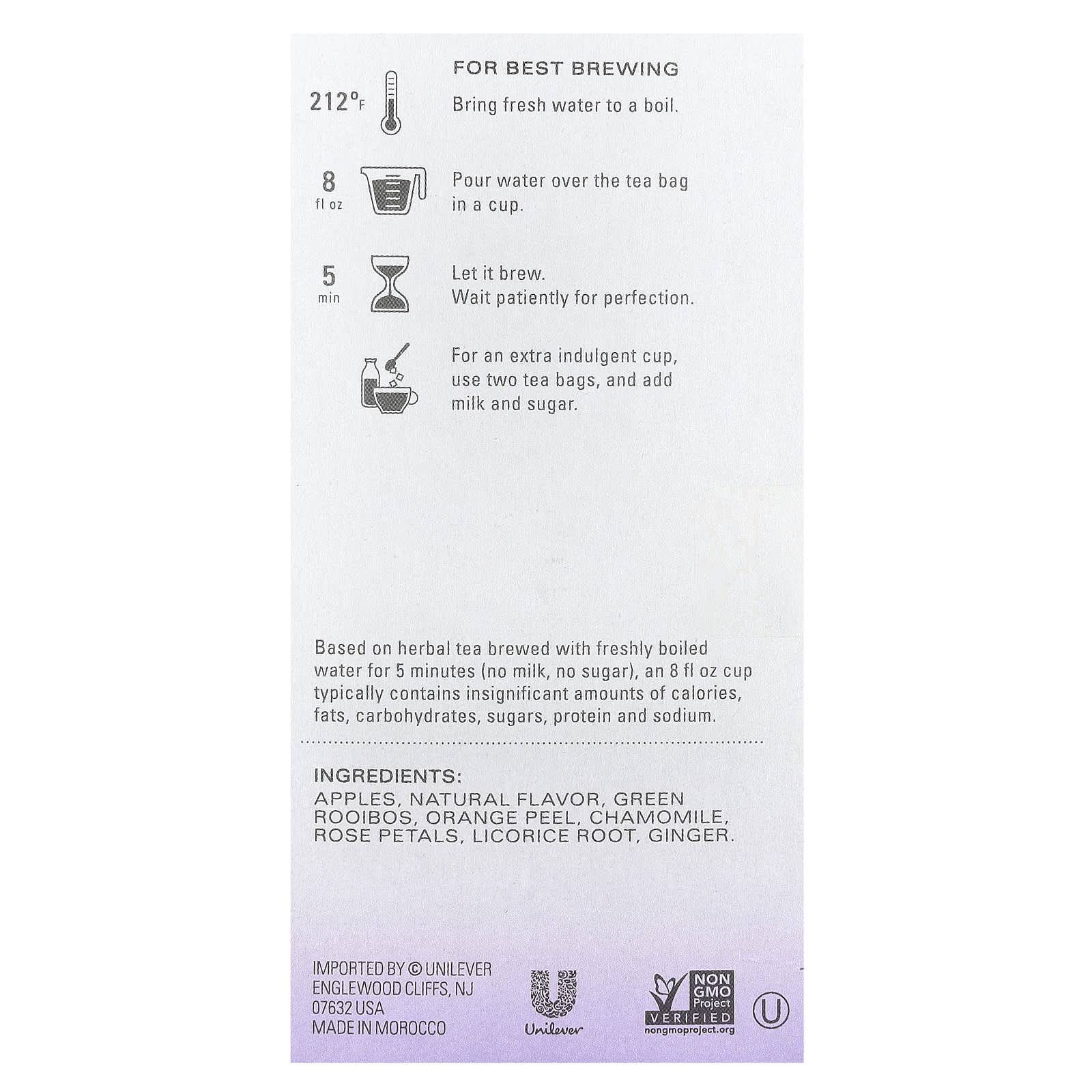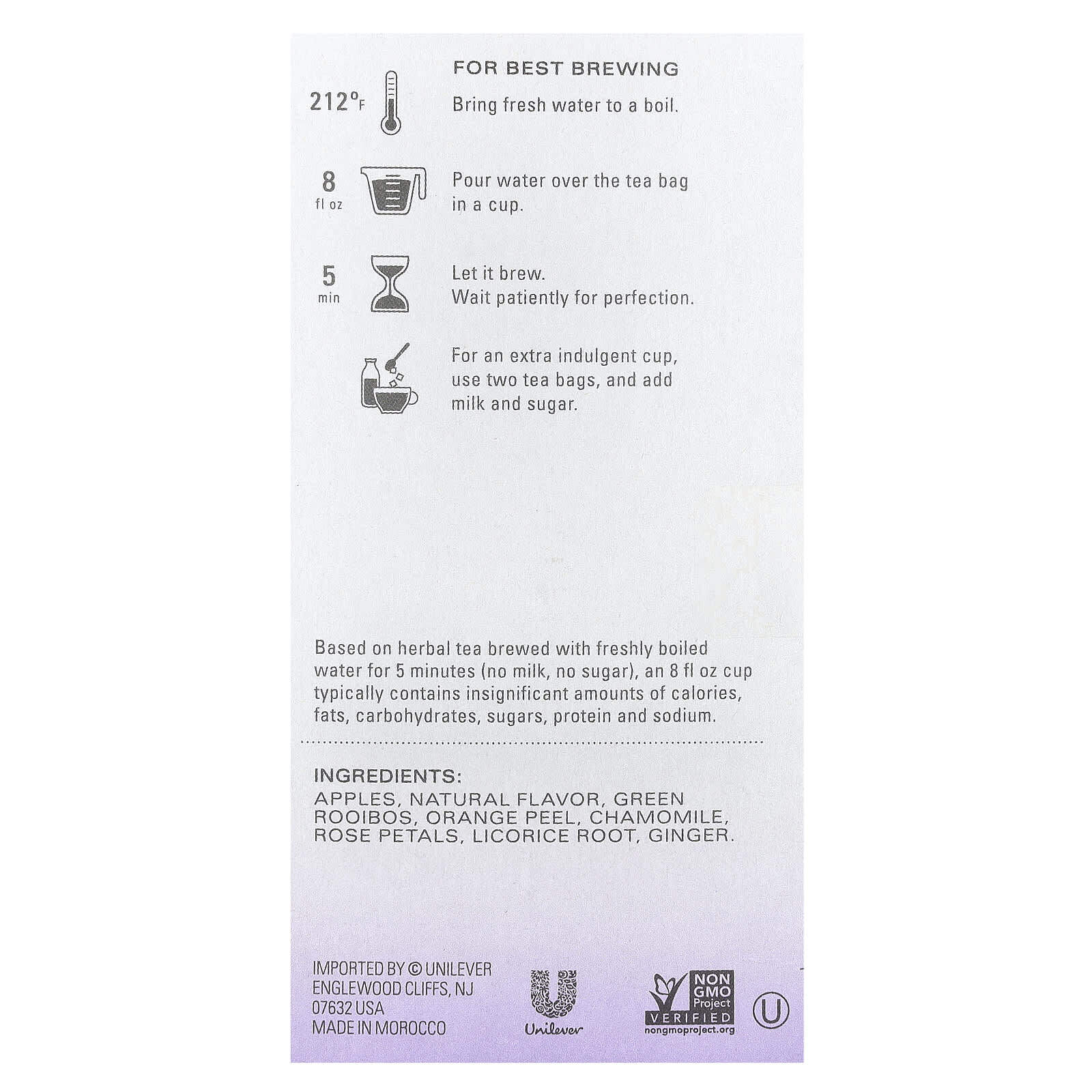 Яблоки, натуральный ароматизатор, зеленый ройбуш, апельсиновая цедра, ромашка, лепестки роз, корень солодки, имбирь.