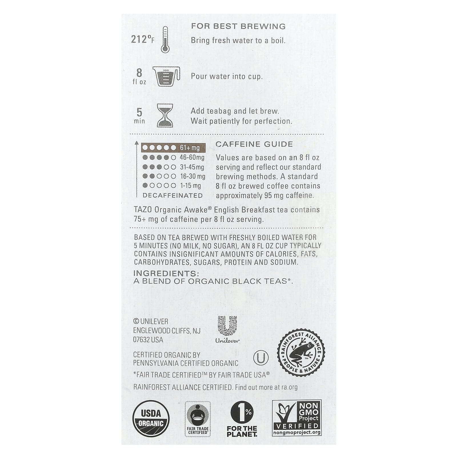 Чай TAZO Organic Awake® English Breakfast содержит более 75 мг кофеина на порцию (240 мл).