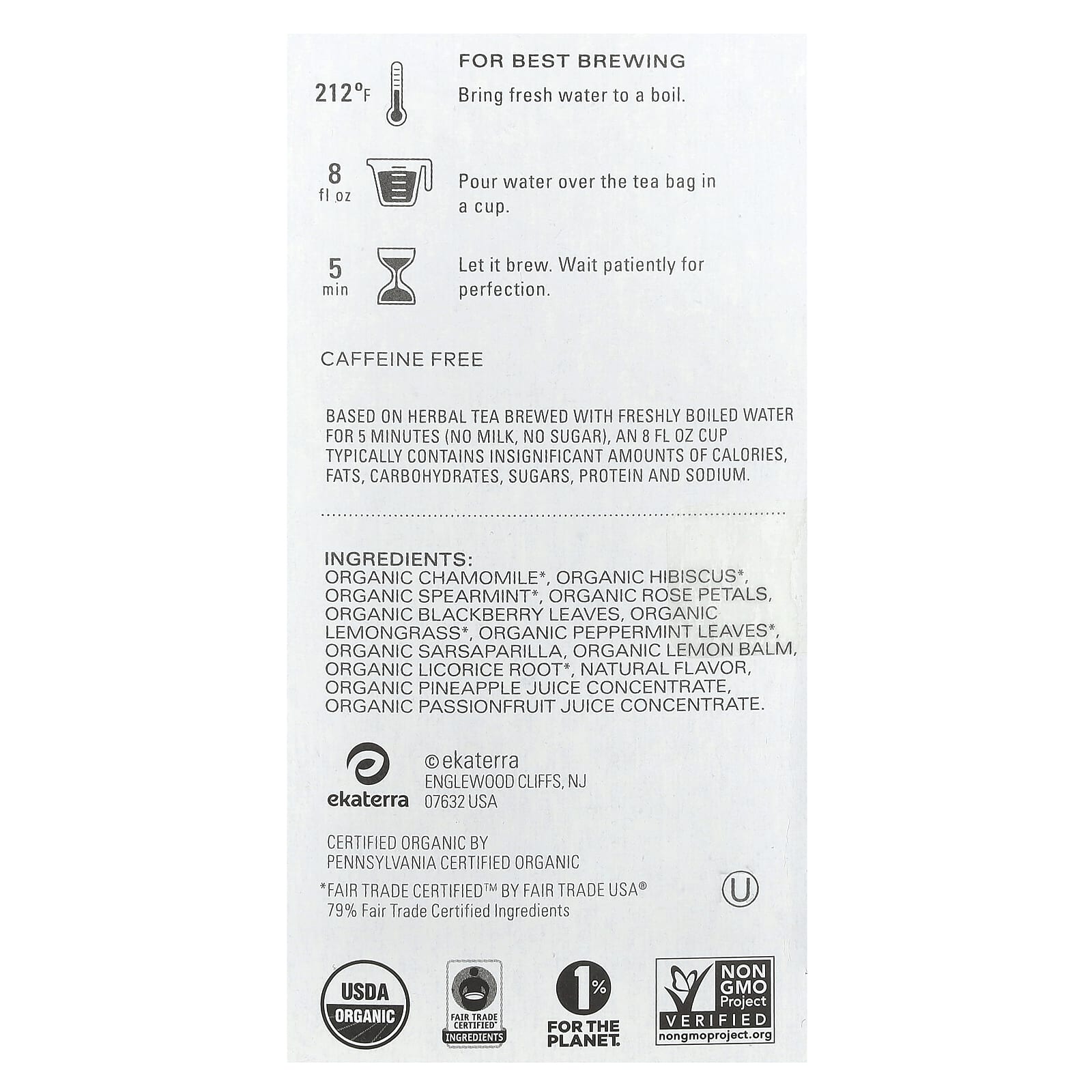 Органическая ромашка *, органический гибискус *, органическая мята *, органические лепестки роз, органические листья ежевики, органический лемонграсс *, органические листья перечной мяты *, органическая сарсапарилла, органическая мелисса, органический корень солодки *, натуральный ароматизатор, концентрат органического ананасового сока, органический концентрат сока маракуйи.