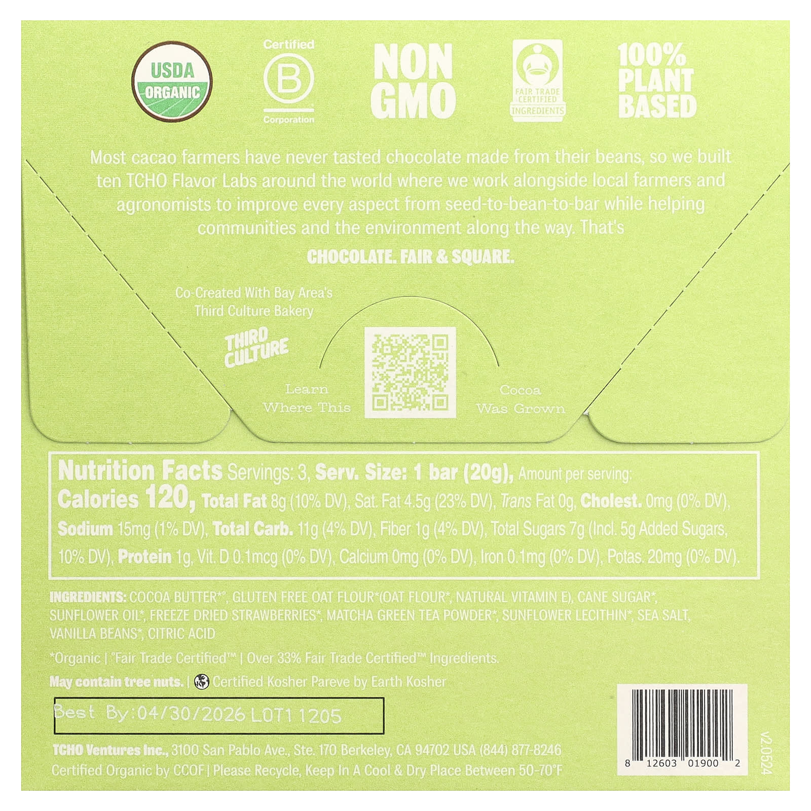 Какао-масло*°, овсяная мука без глютена* (овсяная мука*, натуральный витамин Е), тростниковый сахар*, подсолнечное масло*, сублимированная клубника*, зеленый чай матча в порошке*, подсолнечный лецитин*, морская соль, стручки ванили*, лимонная кислота.