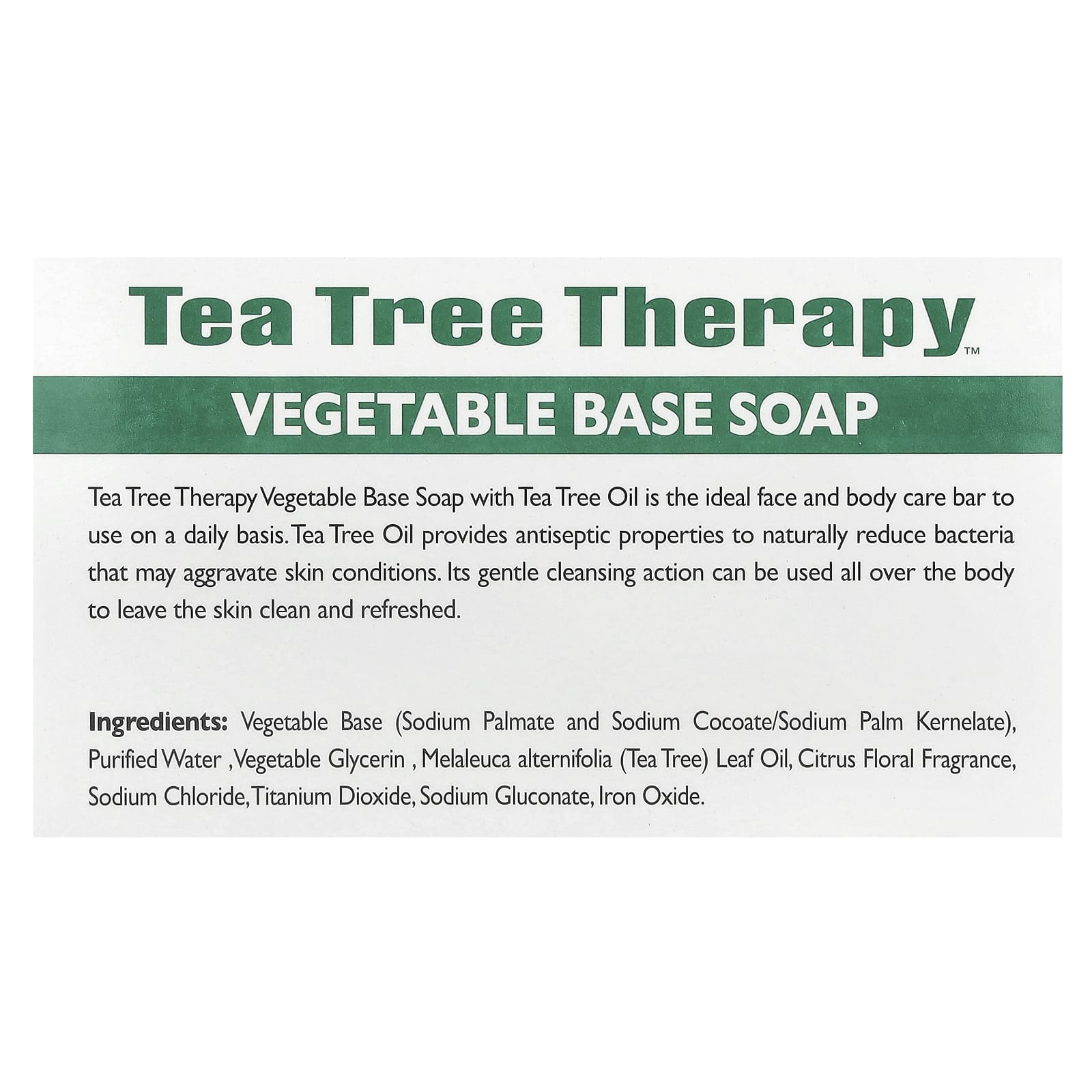 Vegetable base (sodium palmate and sodium cocoate/sodium palm kernelate), purified water, vegetable glycerin, melaleuca alternifolia (tea tree) leaf oil, citrus floral fragrance, sodium chloride, titanium dioxide, sodium gluconate, iron oxide.