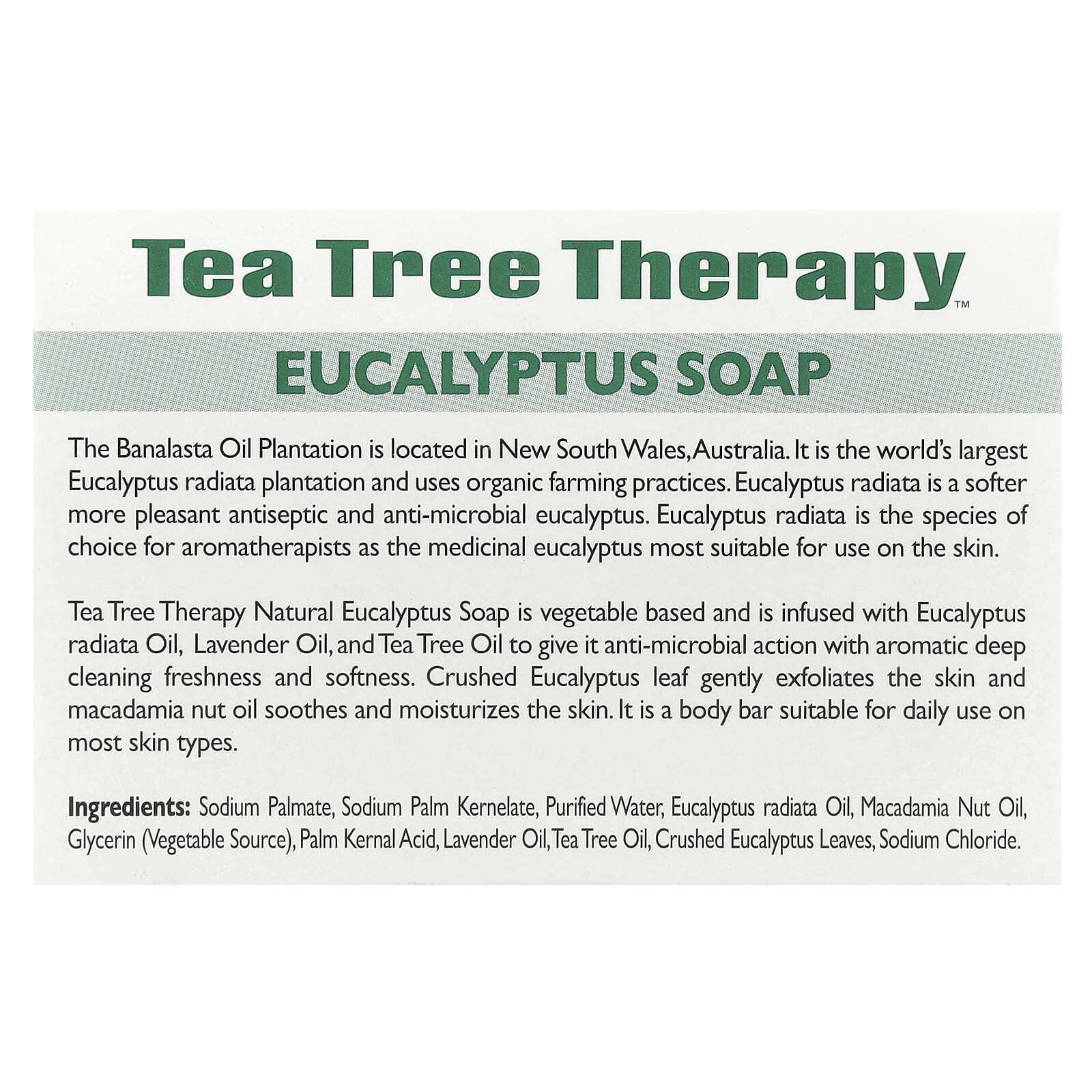 Sodium palmate, sodium palm kernelate, purified water, eucalyptus radiata oil, macadamia nut oil, glycerin (vegetable source), palm kernal acid, lavender oil, tea tree oil, crushed eucalyptus leaves, sodium chloride.