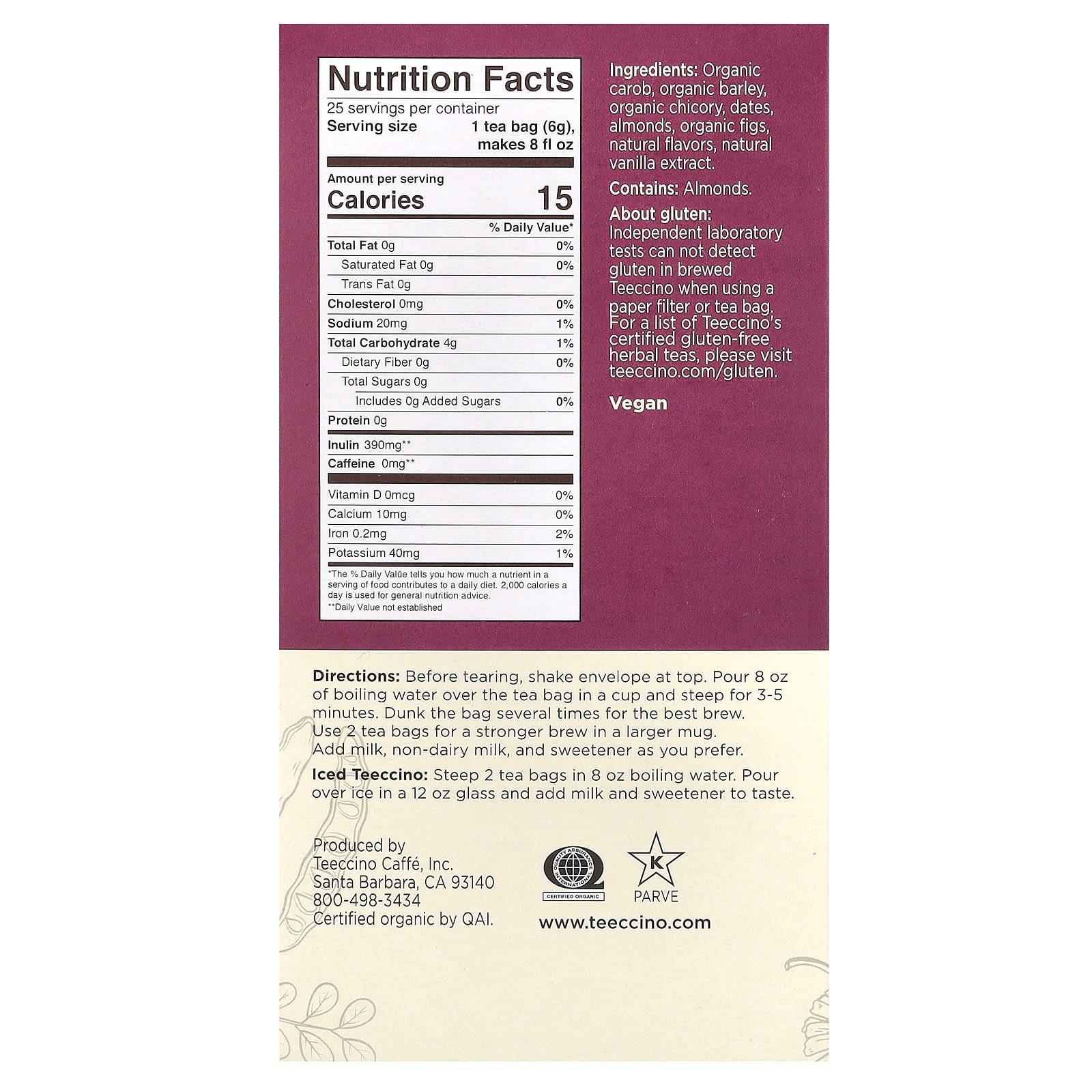 Teeccino, обжаренный травяной чай, ванильно-ореховый вкус, без кофеина, 25 чайных пакетиков, 150 г (5,3 унции)