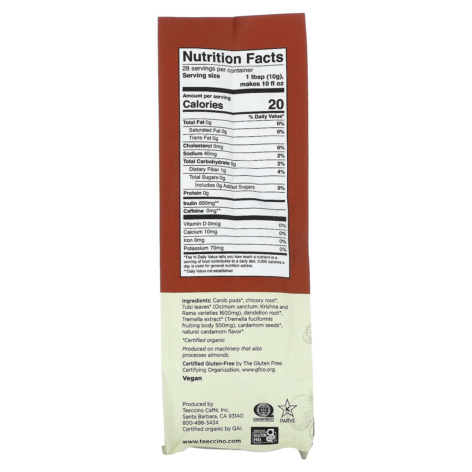 Стручки рожкового дерева *, корень цикория*, листья тулси * (Ocimum sanctum: разновидности кришна и рама, 1600 мг), корень одуванчика*, экстракт тремеллы * (плодовое тело тремеллы фуциформной, 500 мг), семена кардамона *, натуральный ароматизатор «Кардамон» *.
