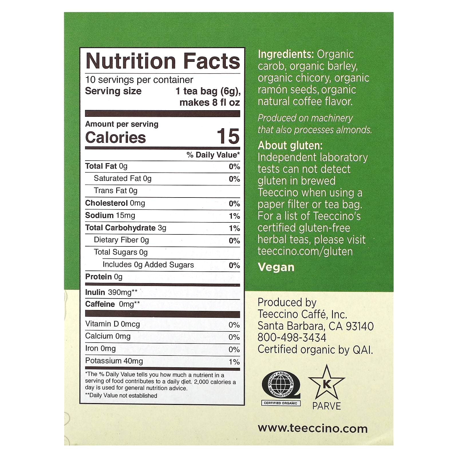 И любителям кофе, и любителям чая понравится приятный крепкий вкус Teeccino. Поклонники этого напитка считают, что вкус Teeccino более мягкий, более насыщенный и более сливочный по сравнению с кофе. В чем секрет? Во французском цикории, обжаренном корне, который часто добавляют в кофе, смешанном с ячменем, любимым итальянским сортом без кофеина, и испанским рожковым деревом, известным своим шоколадным привкусом. Обогащен семенами рамона, традиционным жареным напитком майя. Teeccino готовит вкусный чай ... или кофе? Попробуйте и решите сами!