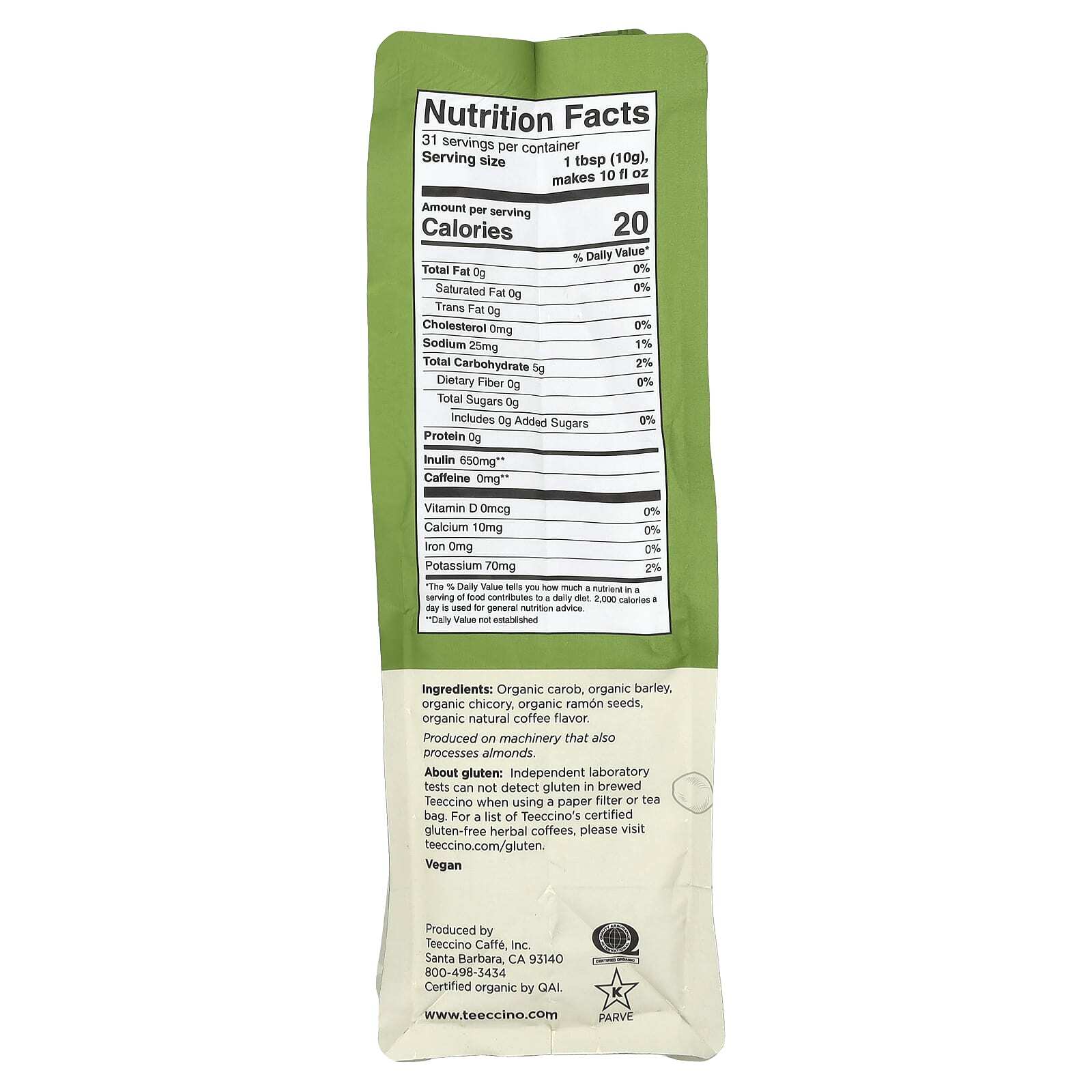 О глютене. Независимые лабораторные тесты не обнаруживают глютен в заваренном Teeccino при использовании бумажного фильтра или чайного пакетика.