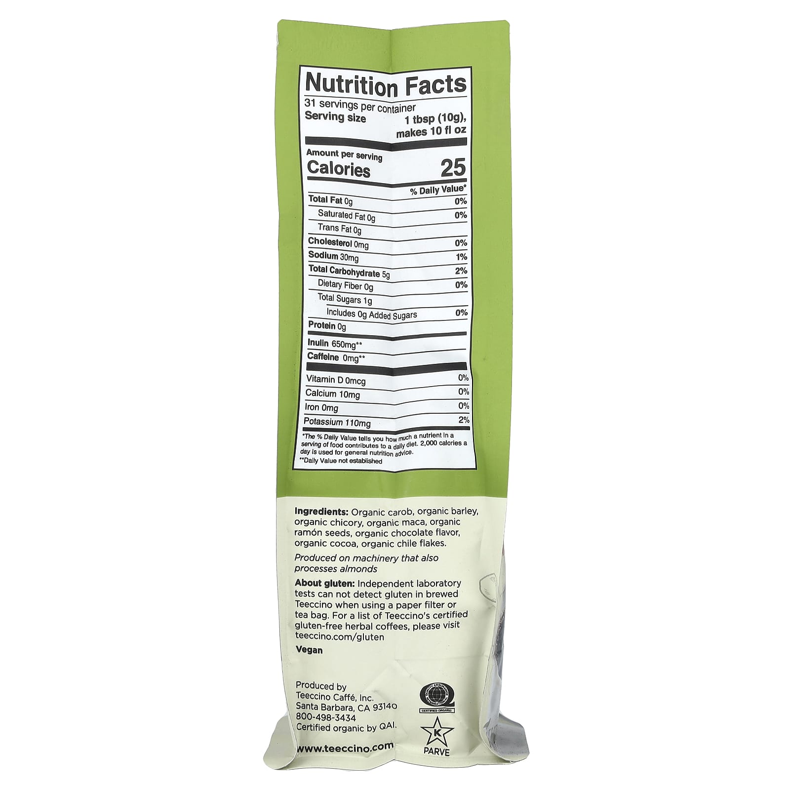 О глютене. Независимые лабораторные тесты не обнаруживают глютен в заваренном Teeccino при использовании бумажного фильтра или чайного пакетика.