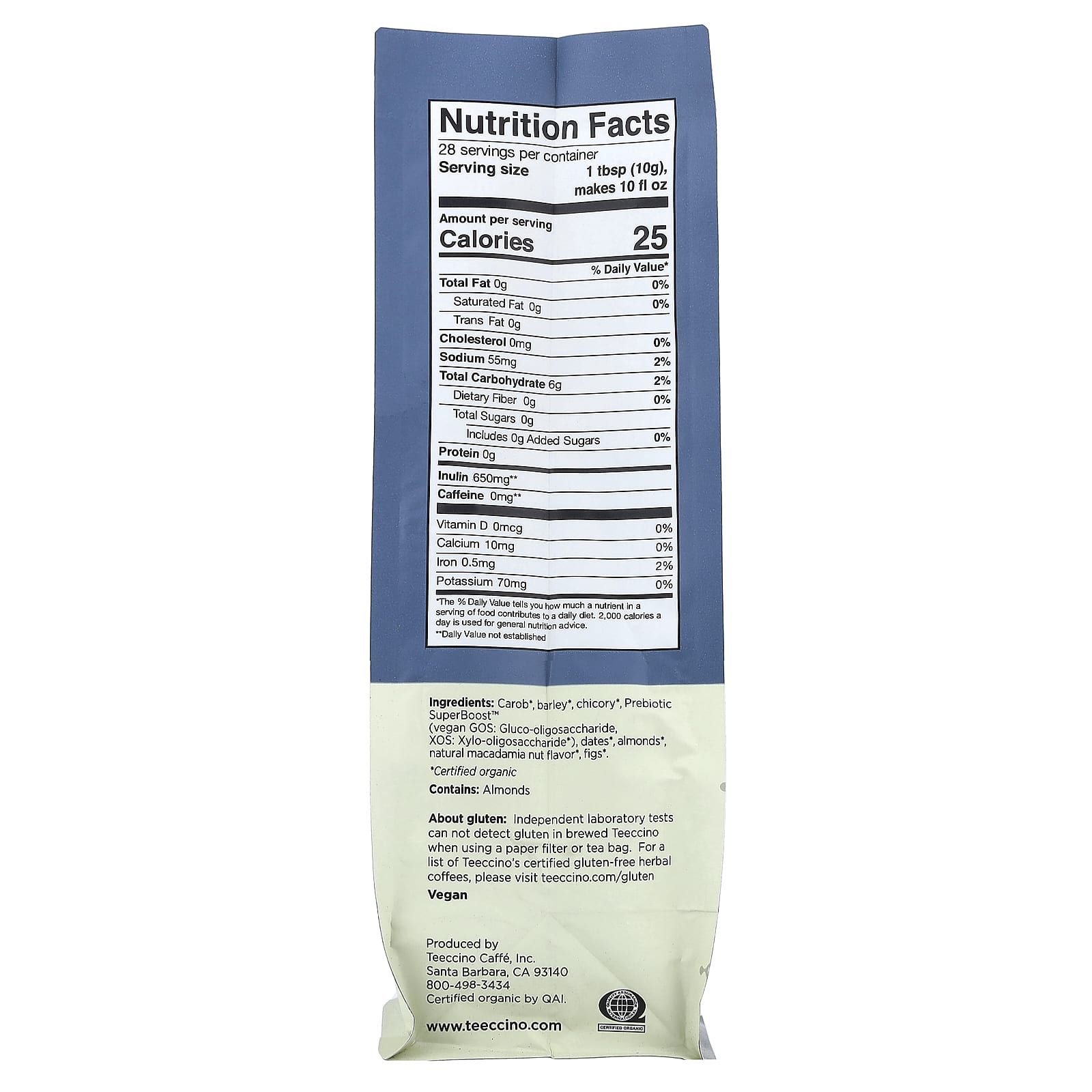О глютене. Независимые лабораторные тесты не обнаруживают глютен в заваренном Teeccino при использовании бумажного фильтра или чайного пакетика.