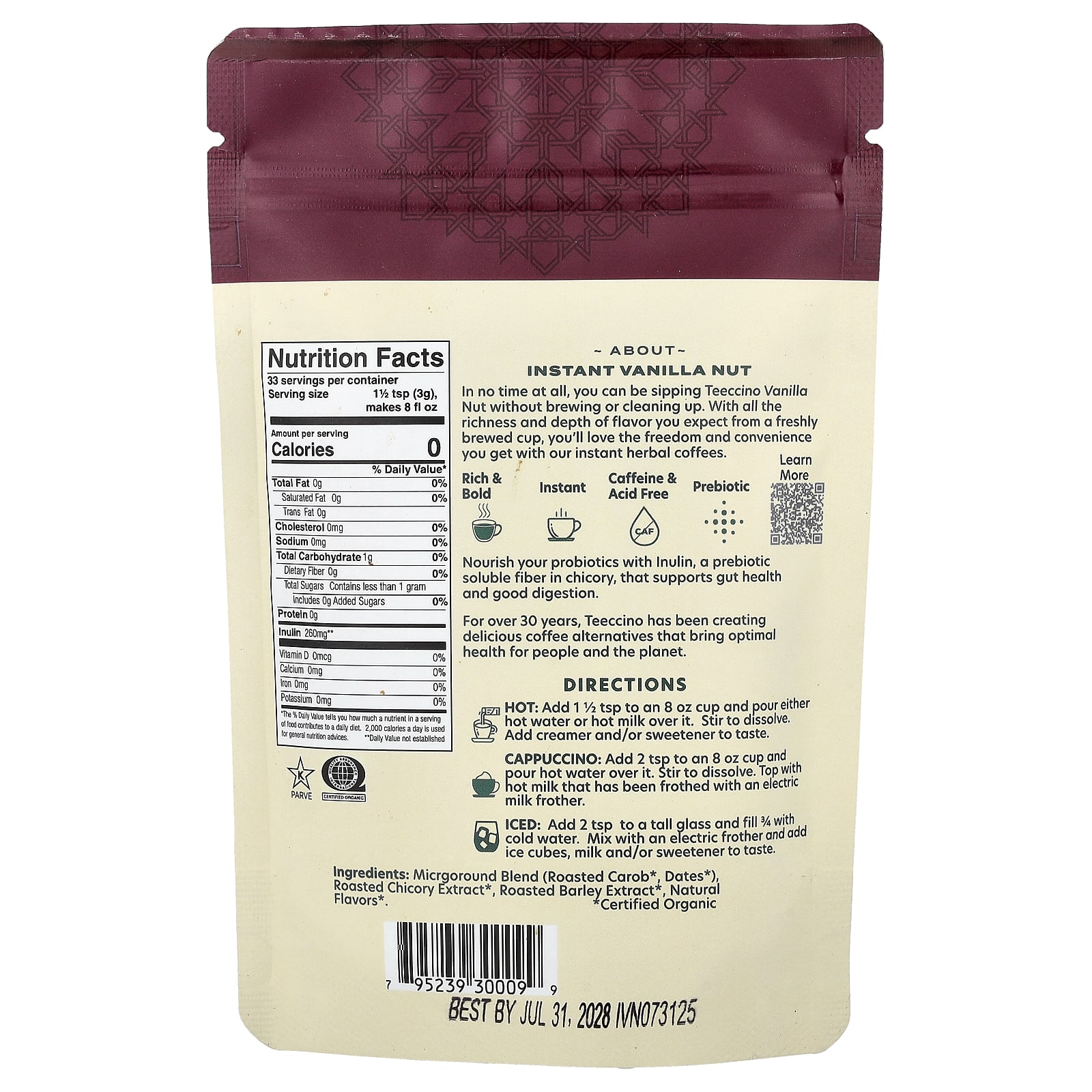 Вы очень быстро сможете употреблять Teeccino с орехами и ванилью, не заваривая и не очищая чай. Наш растворимый травяной кофе обладает насыщенным и глубоким вкусом, который вы ожидаете от чашечки свежесваренного кофе. Благодаря этому вы оцените гибкость и удобство использования.