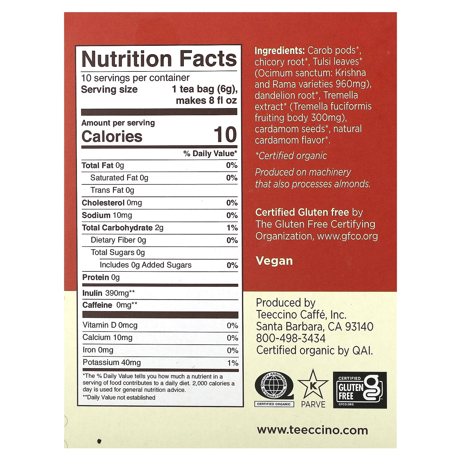 Стручки рожкового дерева *, корень цикория*, листья тулси * (Ocimum sanctum: разновидности кришна и рама, 960 мг), корень одуванчика*, экстракт тремеллы * (плодовое тело тремеллы фуциформной, 300 мг), семена кардамона *, натуральный ароматизатор «Кардамон» *.