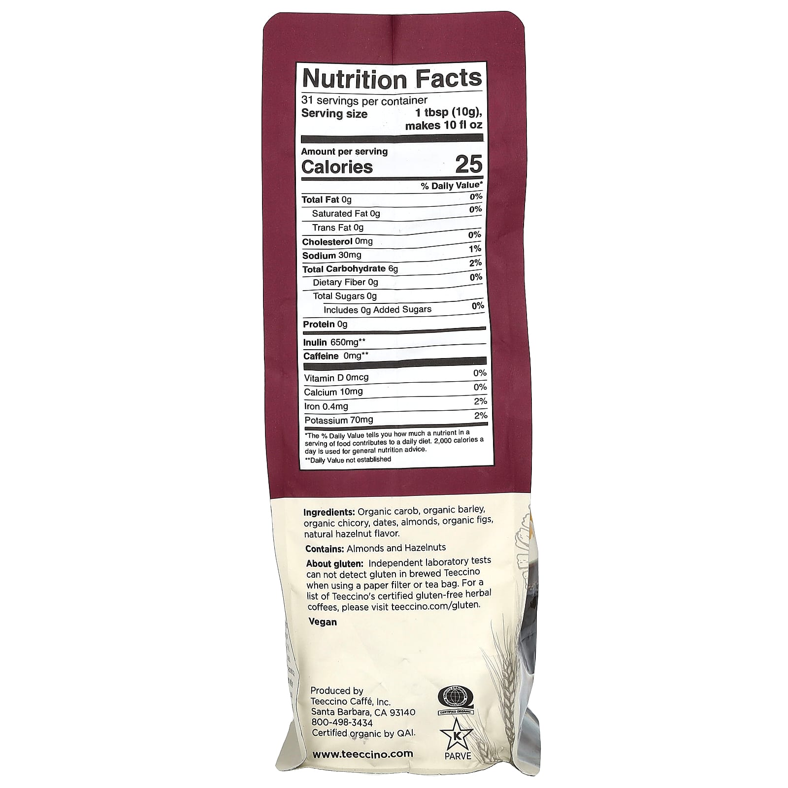 О глютене. Независимые лабораторные тесты не обнаруживают глютен в заваренном Teeccino при использовании бумажного фильтра или чайного пакетика.