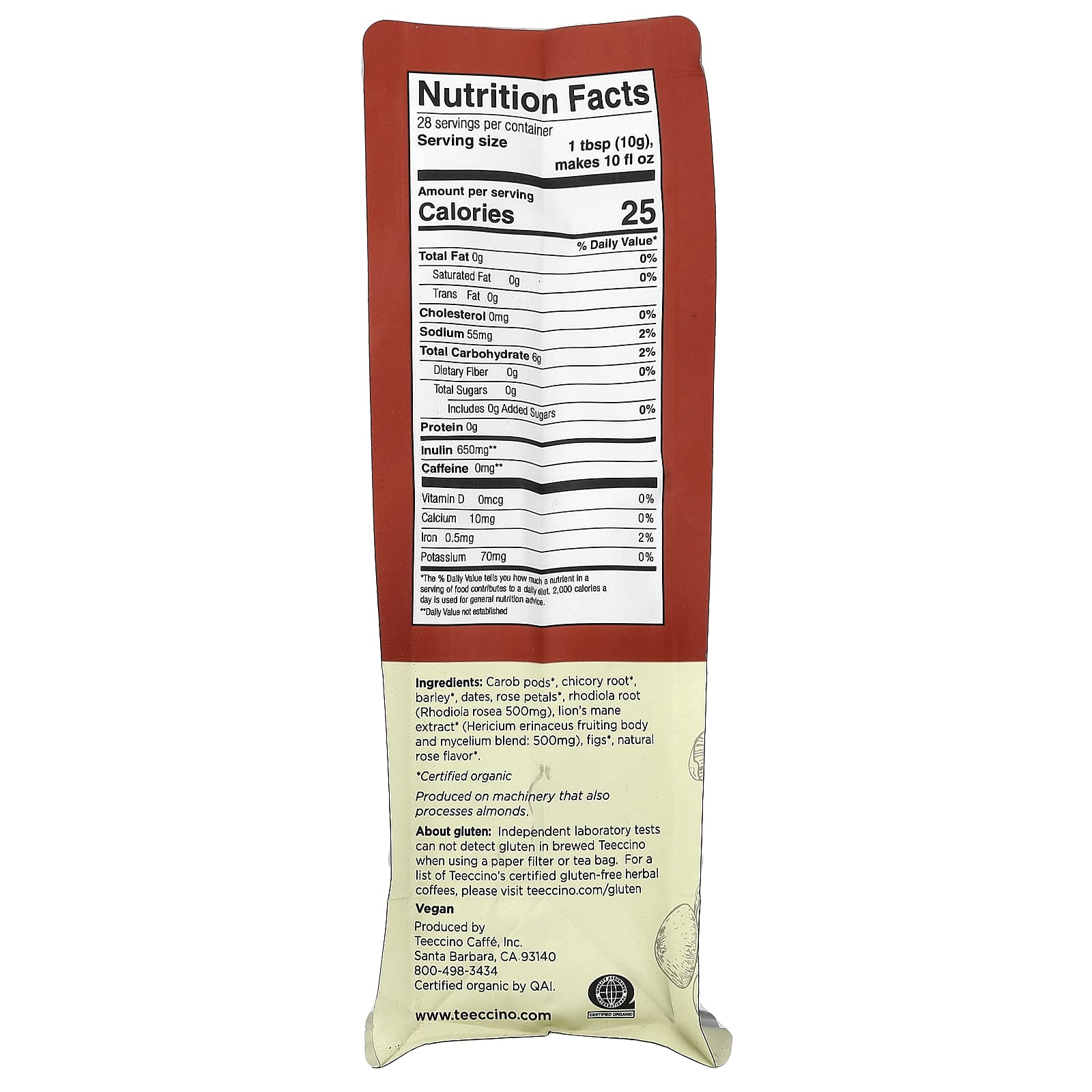 О глютене. Независимые лабораторные тесты не обнаруживают глютен в заваренном Teeccino при использовании бумажного фильтра или чайного пакетика.