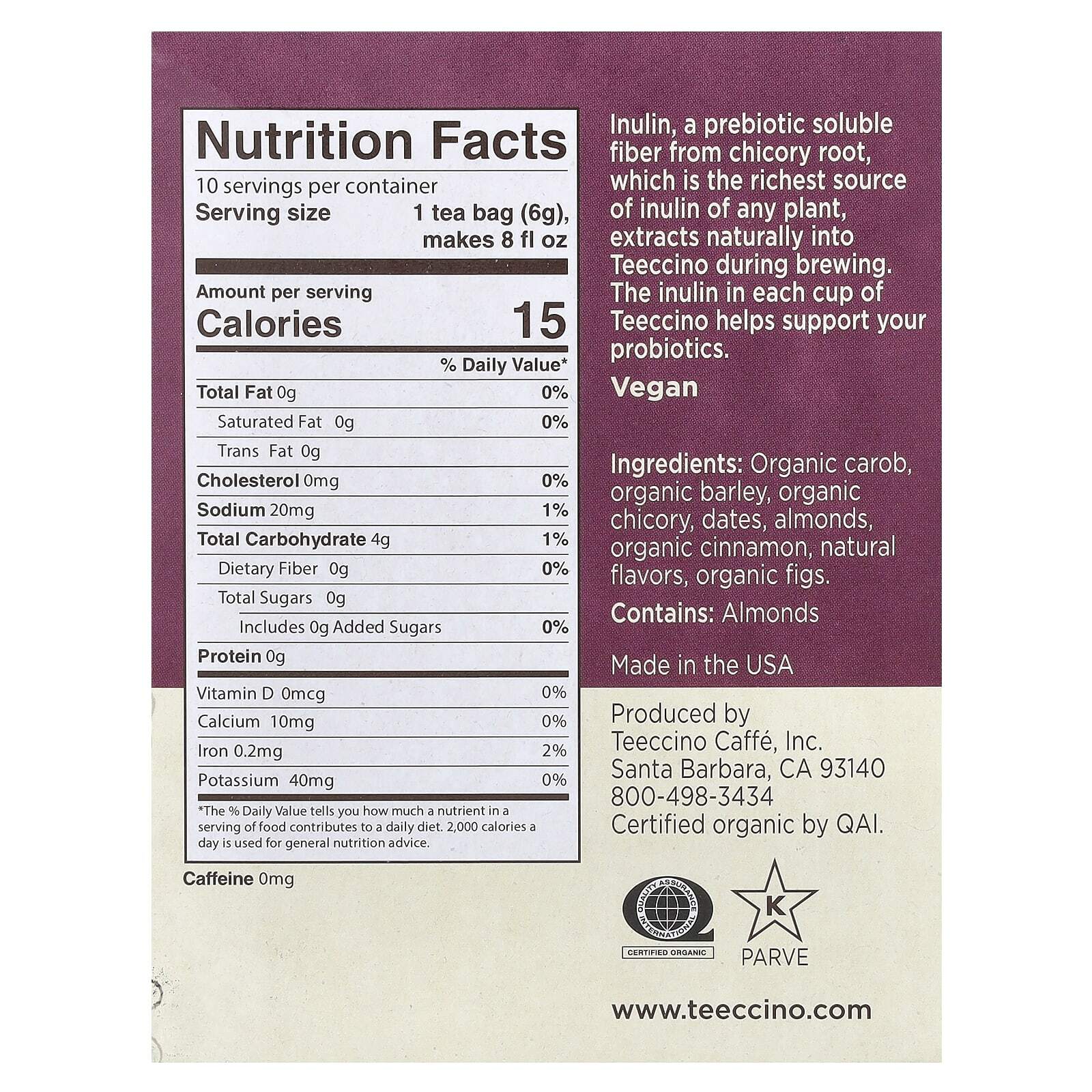 Любите ли вы чай или кофе, вам понравится насыщенный, насыщенный вкус Teeccino, который поклонники называют более мягким, насыщенным и сливочным, чем кофе. В чем секрет? Французский цикорий, обжаренный корень, который часто добавляют в кофе, смешанный с ячменем, любимым итальянским обжаренным пивом без кофеина, и испанским рожковым деревом, известным своим шоколадным вкусом. Обогащенный калифорнийским миндалем, финиками и инжиром, Teeccino делает чашку восхитительного чая ... или кофе? Мы предоставим вам право решать!