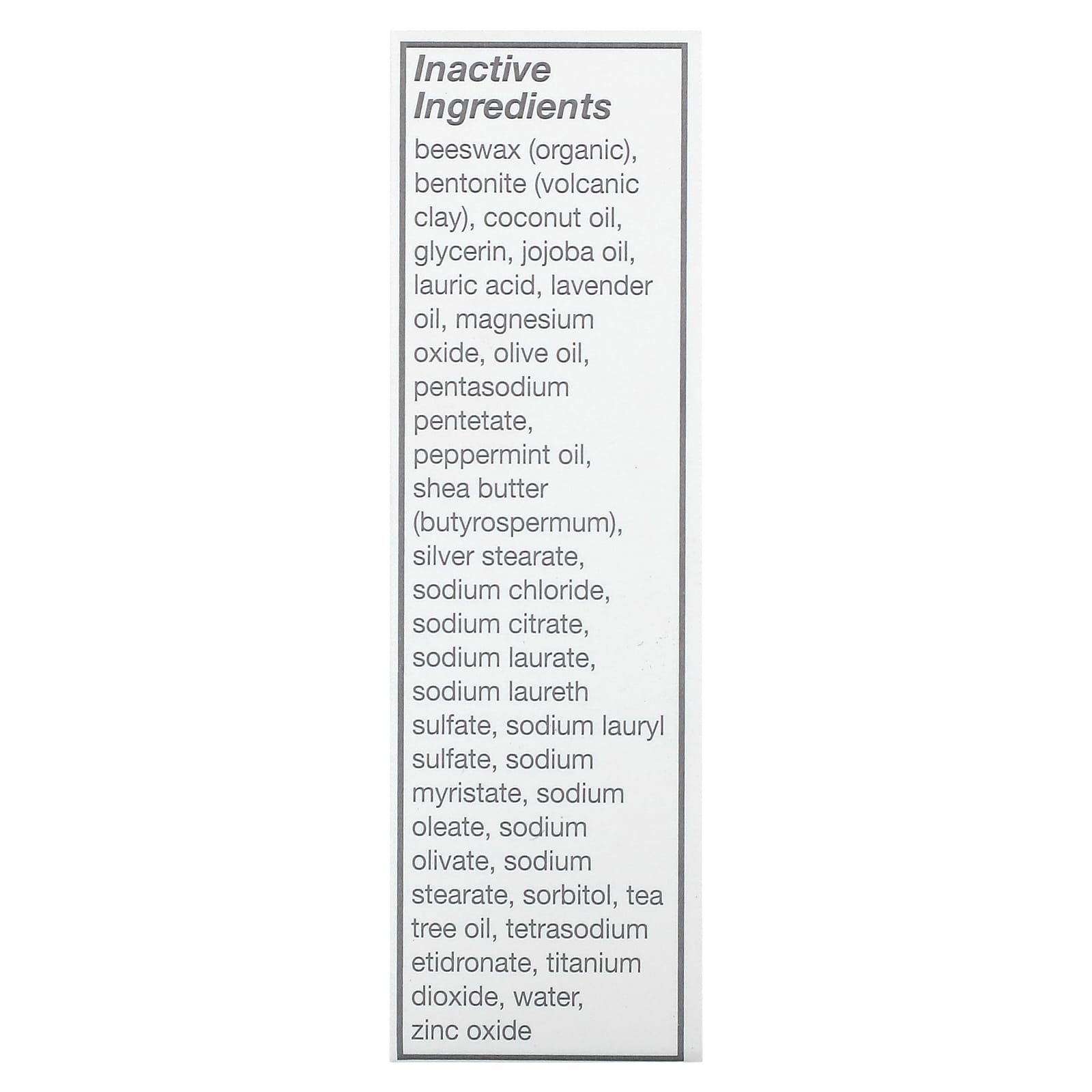 | Вспомогательные ингредиенты : пчелиный воск (органический), бентонит (вулканическая глина), кокосовое масло, глицерин, масло жожоба, лауриновая кислота, лавандовое масло, оксид магния, оливковое масло, пентетат натрия, мятное масло, масло ши (Butyrospermum), стеарат серебра, хлорид натрия , цитрат натрия, лаурат натрия, лауретсульфат натрия, лаурилсульфат натрия, миристат натрия, олеат натрия, оливат натрия, стеарат натрия, сорбитол, масло чайного дерева, этидронат тетранатрия, диоксид титана, вода, оксид цинка. | |