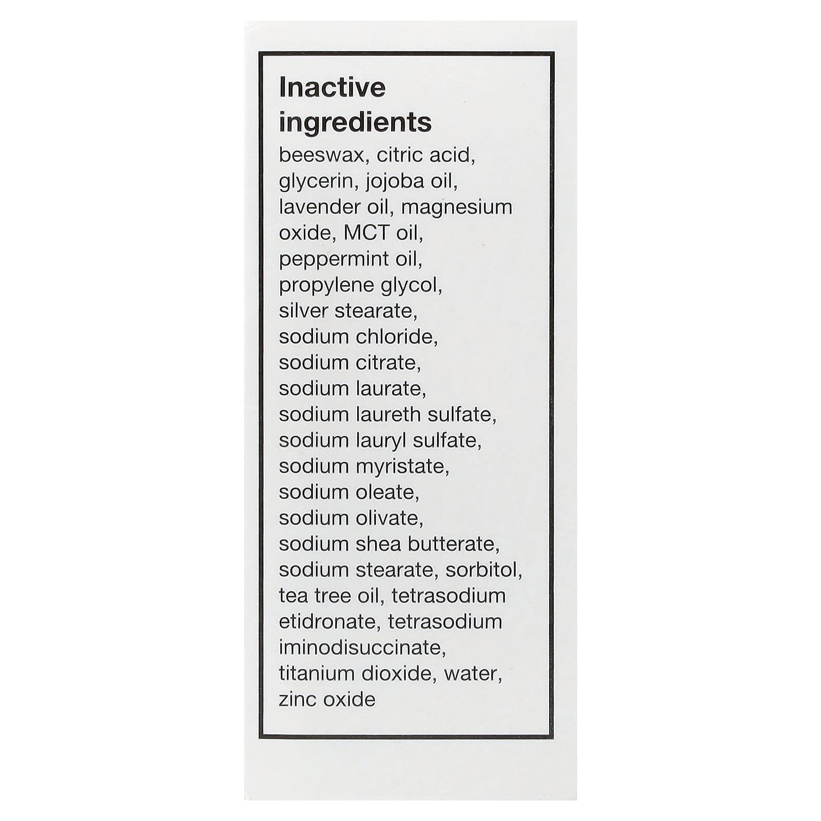 | Вспомогательные ингредиенты: пчелиный воск, лимонная кислота, глицерин, масло жожоба, лавандовое масло, оксид магния, масло MCT, масло перечной мяты, пропиленгликоль, стеарат серебра, хлорид натрия, цитрат натрия, лаурат натрия, лауретсульфат натрия, лаурилсульфат натрия, миристат натрия, олеат натрия , оливат натрия, масло ши, стеарат натрия, сорбитол, масло чайного дерева, этидронат тетранатрия, иминодисукцинат тетранатрия, диоксид титана, вода, оксид цинка. | |