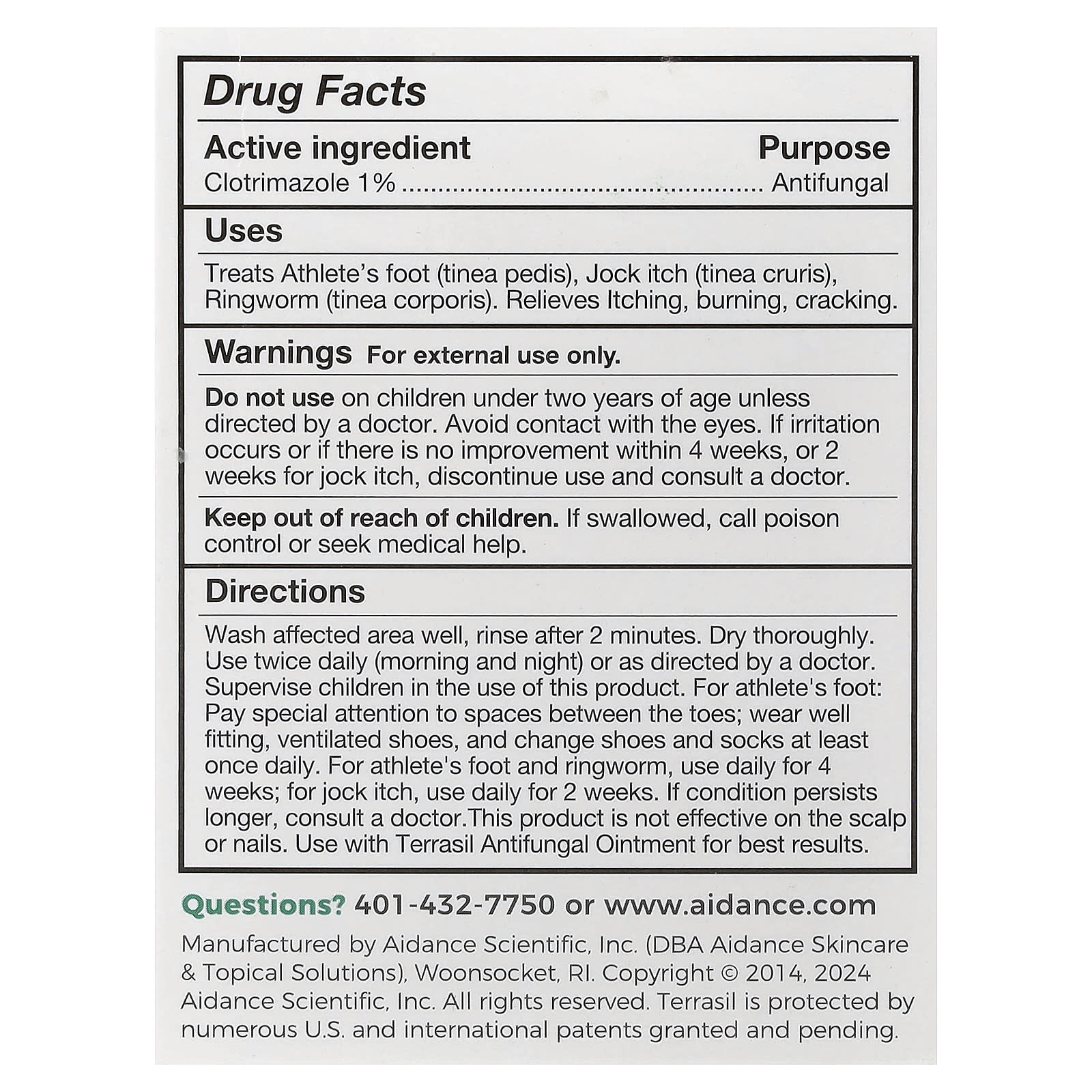 Тщательно промойте пораженный участок, смойте через 2 минуты. Тщательно вытрите насухо. Используйте два раза в день (утром и вечером) или по назначению врача. Не оставляйте детей без присмотра за использованием этого продукта. От грибка стоп: Уделите особое внимание промежуткам между пальцами ног; надевайте удобную, вентилируемую обувь и меняйте обувь и носки как минимум один раз в день. При микозе стоп и стригущем лишае используйте ежедневно в течение 4 недель; от зуда, используйте ежедневно в течение 2 недель. Если состояние сохраняется дольше, обратитесь к врачу. Этот продукт не действует на кожу головы и ногти. Для достижения наилучших результатов используйте с противогрибковой мазью Terrasil.