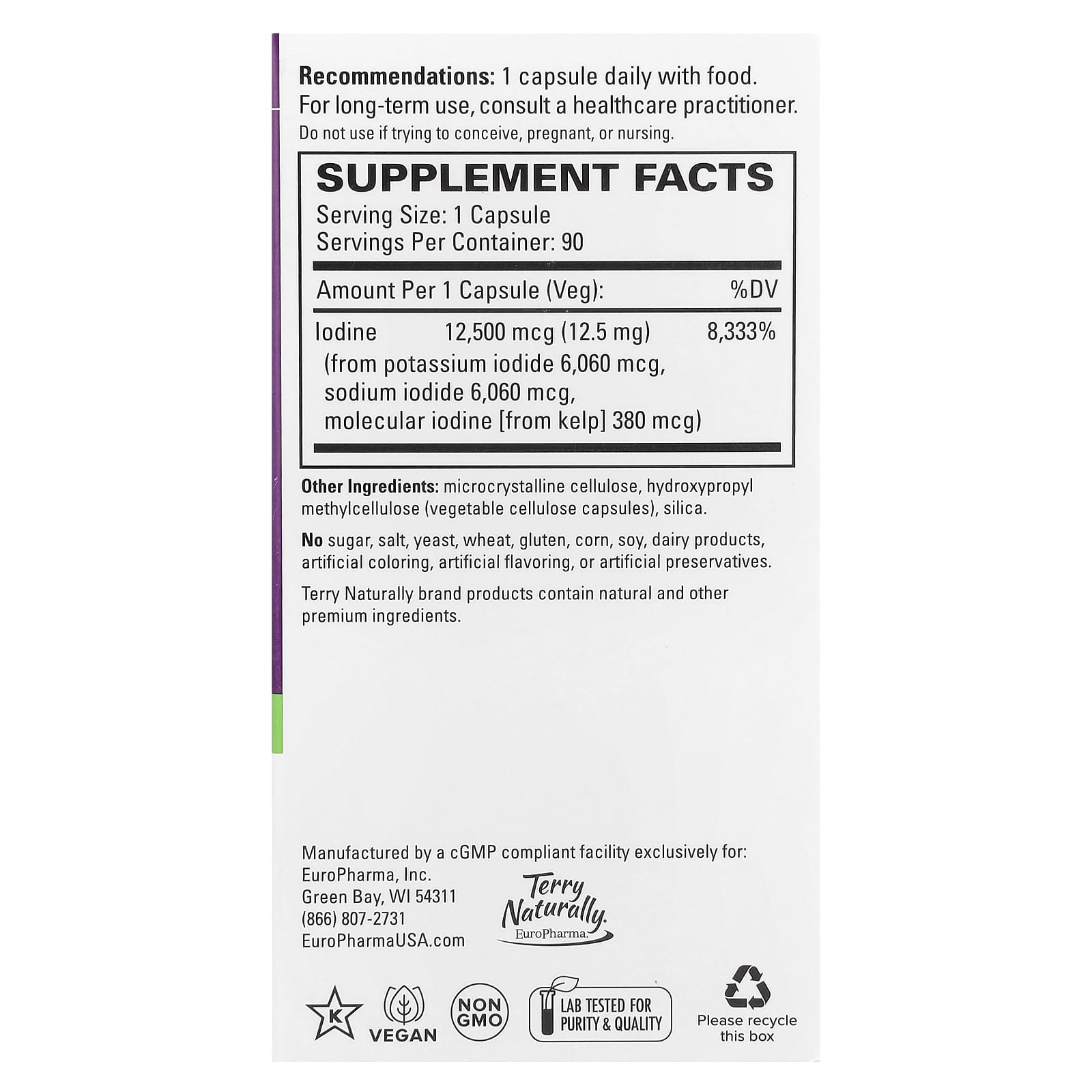 | Йод (в форме йодида калия 6060 мкг, йодида натрия 6060 мкг, молекулярного йода [из бурых водорослей] 380 мкг) | 12 500 мкг (12,5 мг) | 8333 % |