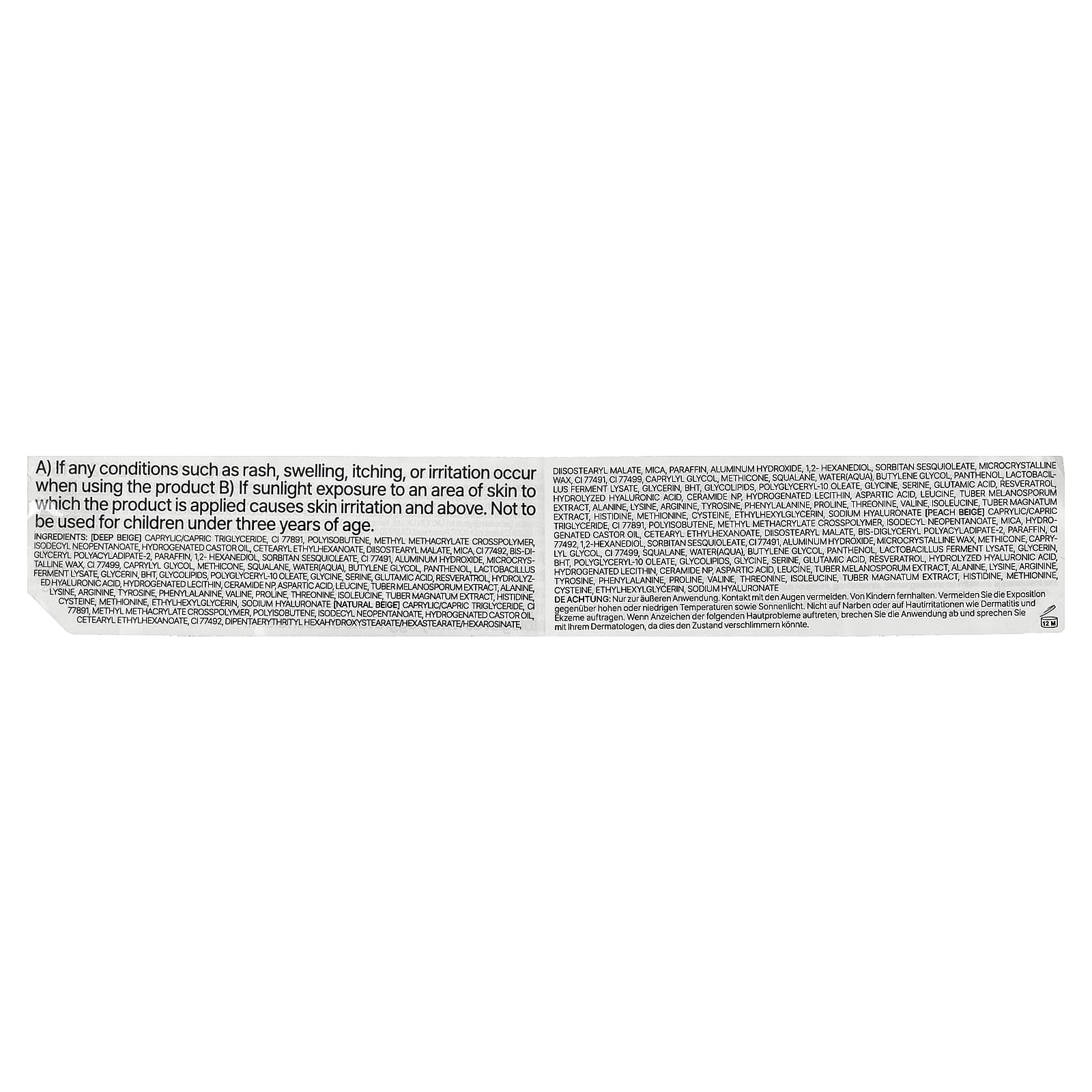 Каприловый/каприновый триглицерид, CI 77891, метил метакрилат кроссполимер, полиизобутен, изодецилнеопентаноат, гидрогенизированное касторовое масло, цетеариловый этилгексаноат, CI 77492, дипентаэритритил гексагидроксистеорат/гексастерат/гексаросинат, диизостеарил малат, слюда, парафина, гидроксид алюминия, 1,2-гександиол, сорбитана сесквиолеат, микрокристаллический воск, CI 77491, CI 77499), каприлилгликоль, метикон, сквалан, вода, бутиленгликоль, пантенол, лизат продукта ферментации лактобактерий, глицерин, бутилгидрокситолуол, гликолипиды, полиглицерил-10 олеат, глицин, серин, глутаминовая кислота, ресвератрол, гидролизованная гиалуроновая кислота, керамид NP, гидрогенизированный лецитин, аспарагиновая кислота, лейцин, экстракт клубня меланоспорума (Tuber melanosporum), аланин, лизин, аргинин, тирозин, фенилаланин, пролин, треонин, валин, изолейцин, экстракт белого трюфеля (Tuber magnatum), гистидин, метионин, цистеин, этилгексилглицерин, гиалуронат натрия.
