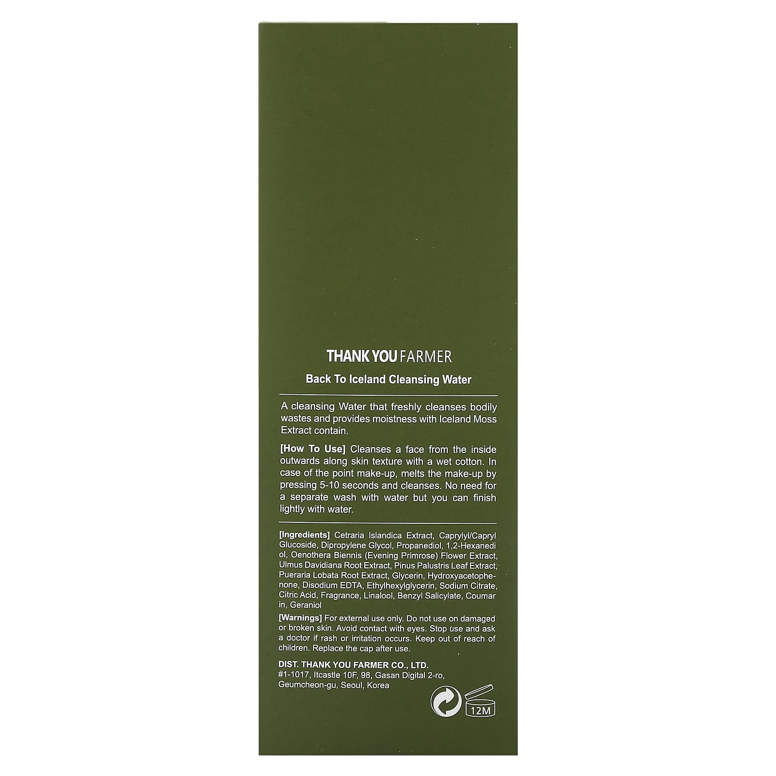 экстракт цетрарии исландской (Cetraria Icelandica), каприлил/каприл глюкозид, дипропиленгликоль, пропандиол, 1,2-гександиол, экстракт цветков примулы вечерней (Oenothera biennis), экстракт корня вяза Давида (Ulmus davidiana), экстракт хвои сосны болотной (Pinus palustris), экстракт корней пуэрарии дольчатой (Pueraria lobata), глицерин, гидроксиацетофенон, двунатриевая ЭДТК, этилгексилглицерин, цитрат натрия, лимонная кислота, отдушка, линалоол, бензилсалицилат, кумарин, гераниол.